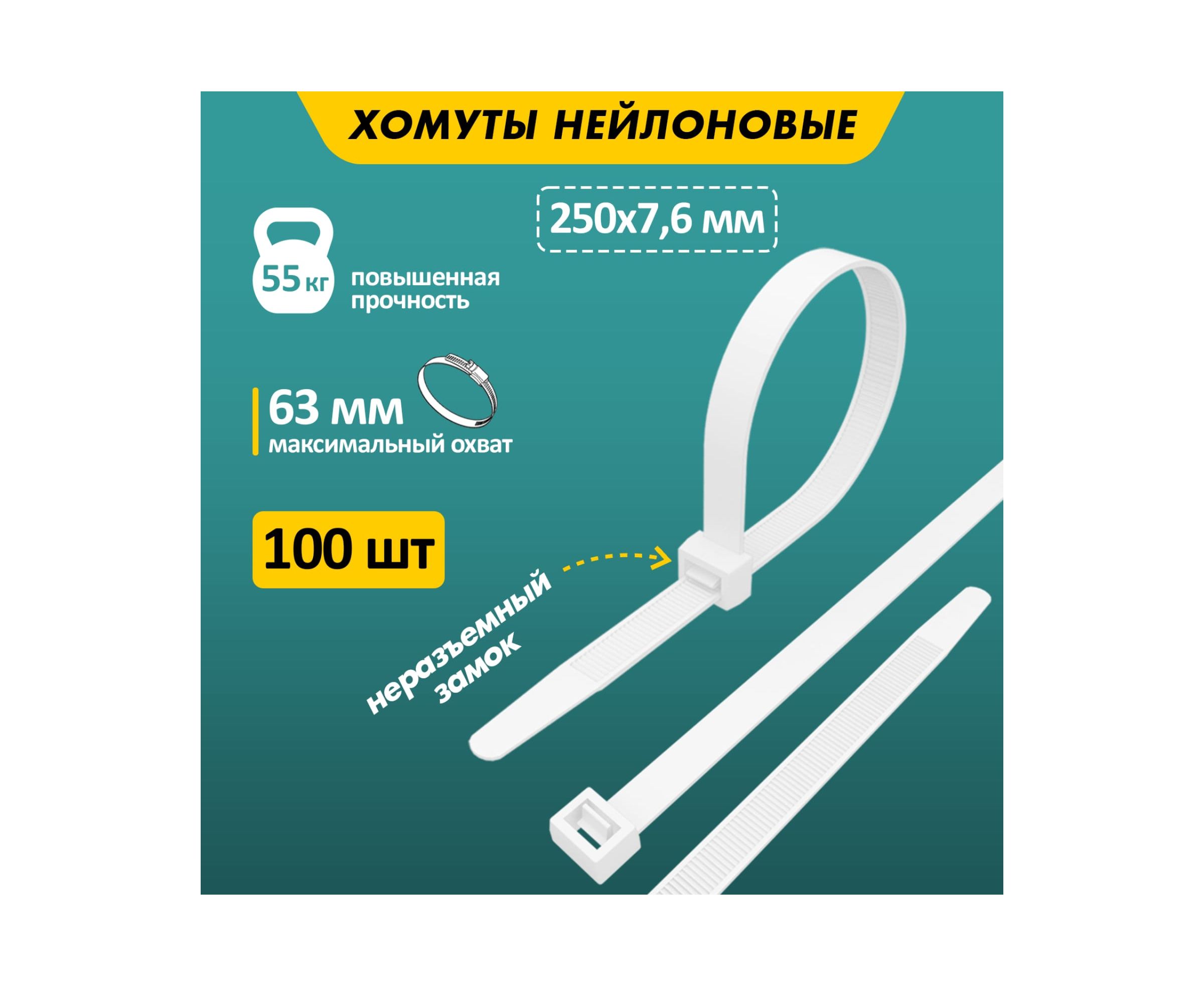 Кабельная нейлоновая хомут-стяжка REXANT 250x7,6 мм, белая, упаковка 100 шт. 07-0252