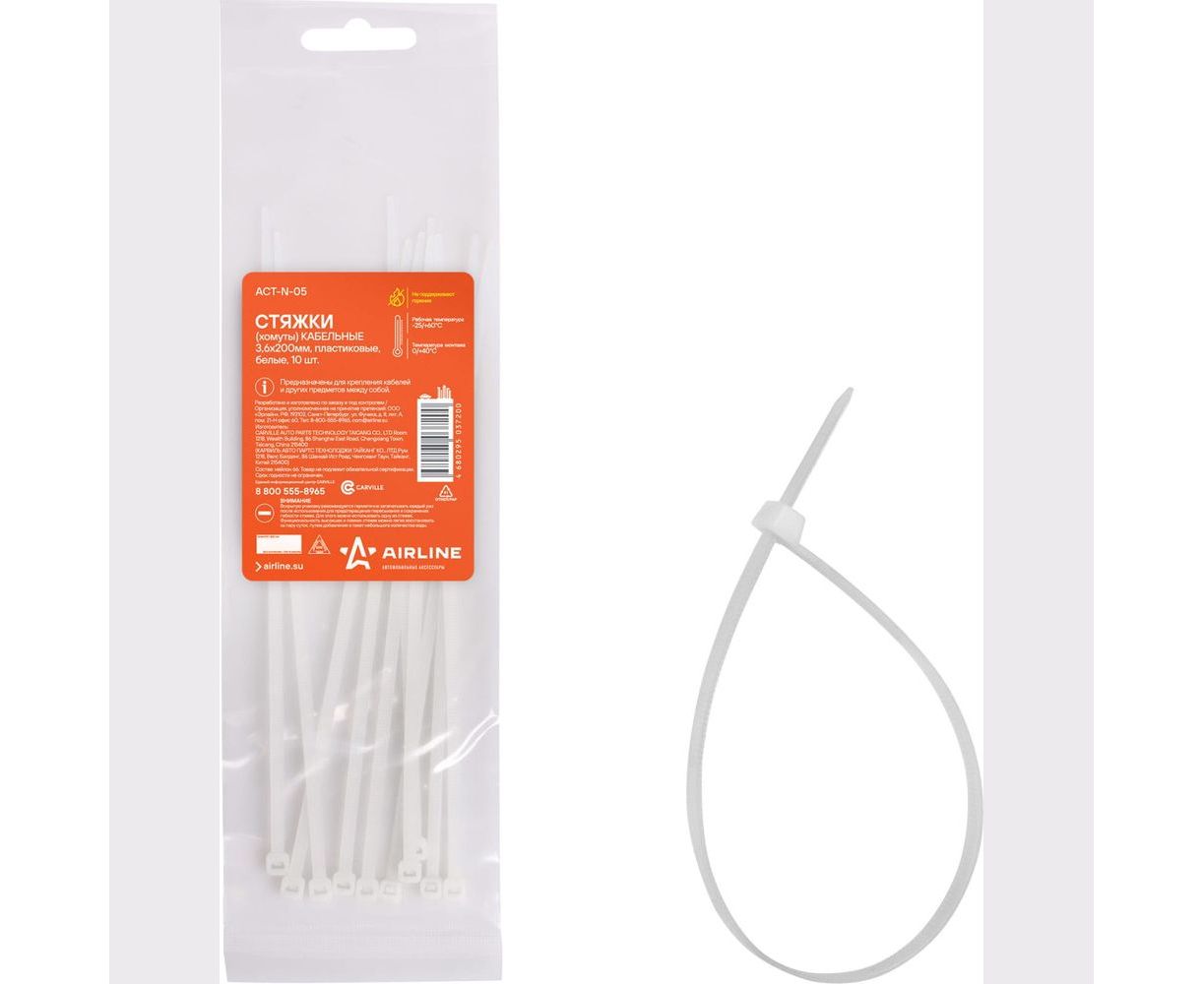 Кабельные стяжки Airline хомуты 3,6 х 200 мм, пластиковые, белые, 10 шт. ACT-N-05 из легкого и прочного нейлона нашли свое применение в быту, промышленной индустрии, строительстве, упаковочной отрасли, на транспорте, в электронике и электромонтажных работах.