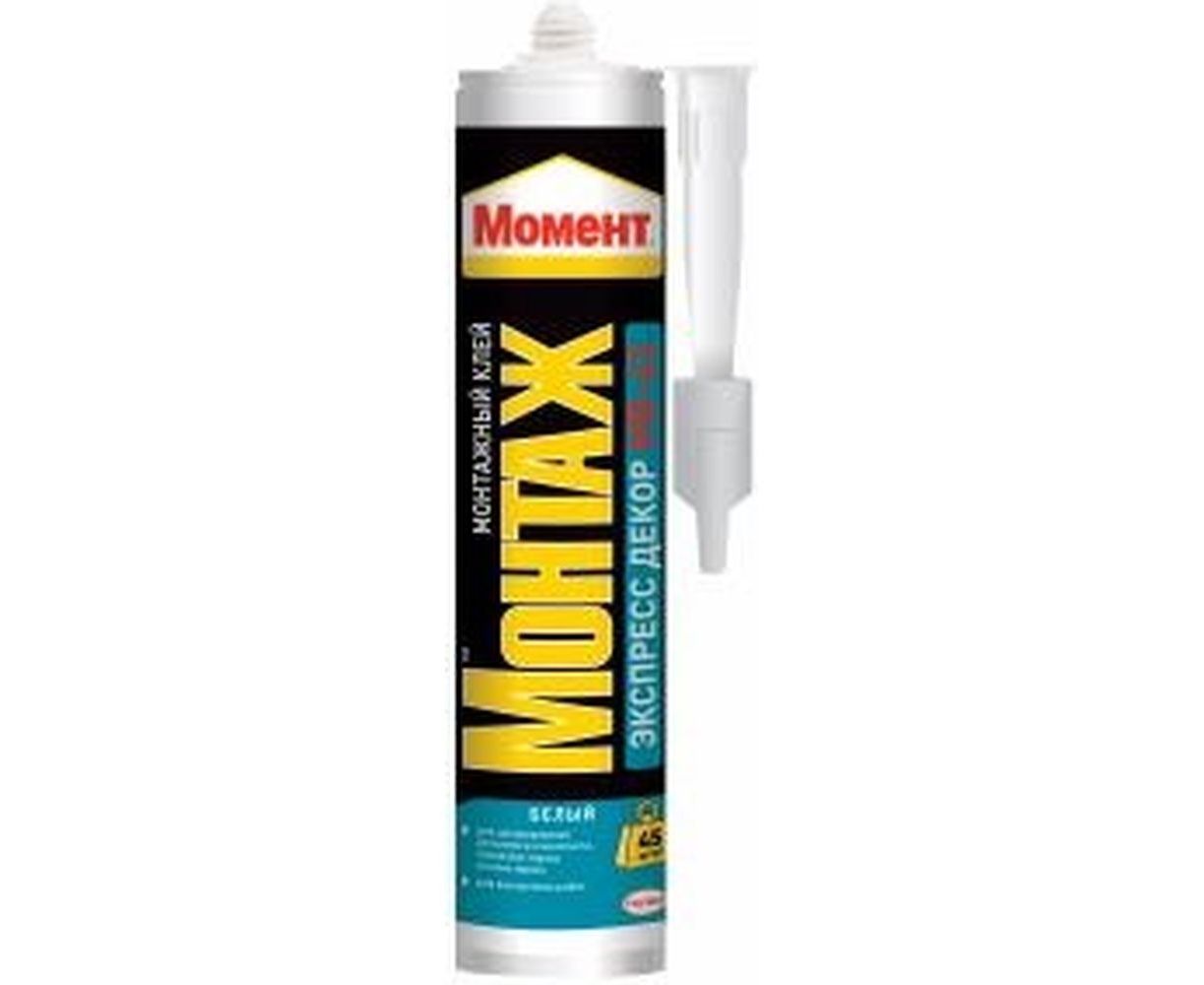 Клей МОНТАЖ экспресс декор Момент 989415 имеет повышенную устойчивость к воздействию влаги. Его применяют для склеивания панелей из стиропора, пенопласта, пенополистирола и других материалов, а также плинтусов и декоративных фризов. Цвет клея — белый. Первоначальная сила склеивания — 45 кг/м2.