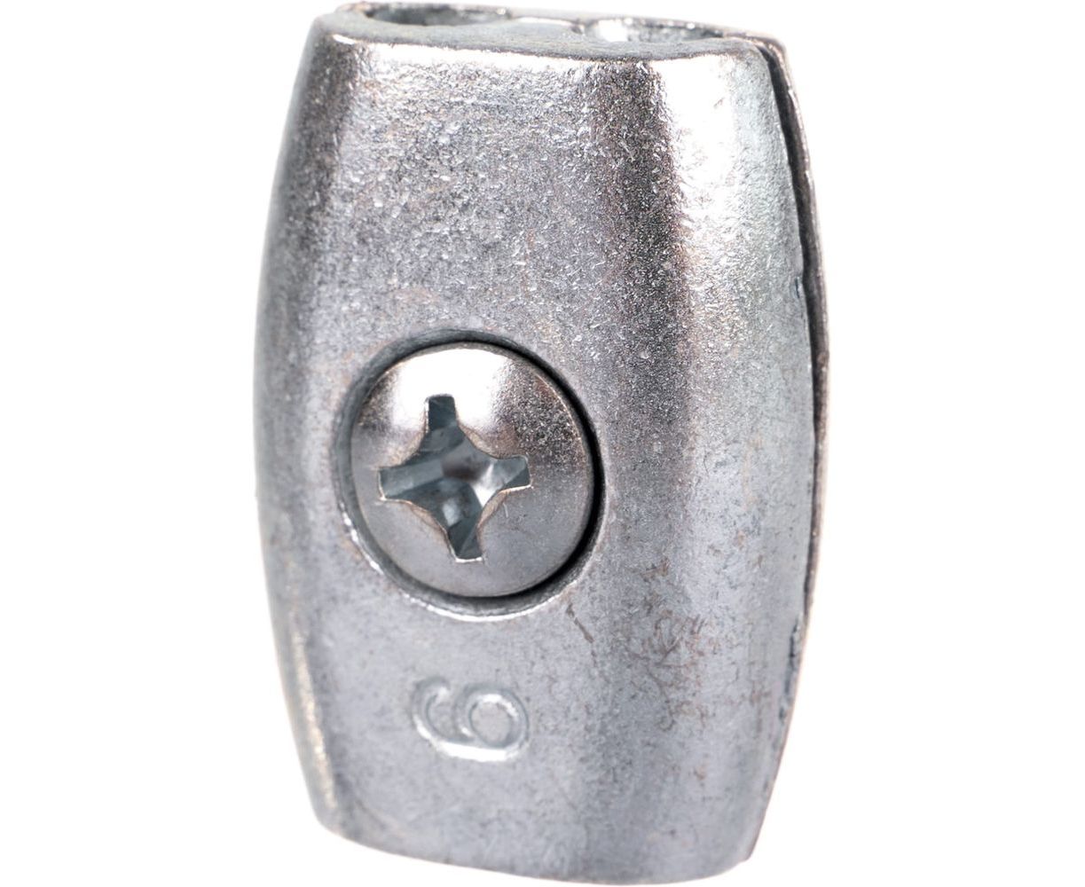 Зажим "Бочонок" Зубр 4-304456-06 изготовлен из цинкового сплава и оцинкованной стали. С его помощью изготавливают петли на концах троса. Для этого свободный конец троса помещается внутрь зажима (конец троса должен выходить из зажима на расстояние не менее чем 1/2 диаметра троса). В полученную петлю закладывают коуш, после которого трос помещается в зажим с другой стороны отверстия. Сверху размещается прижимная крышка, и соединение крепко закручивается с помощью винта.
