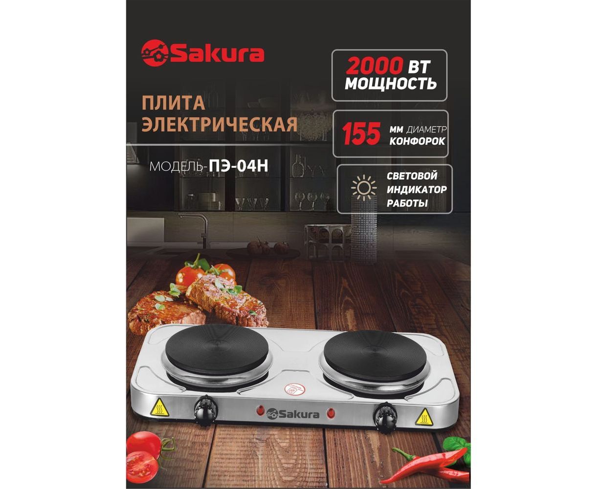 Электрическая плитка Sakura ПЭ-04Н 2000 Вт, 154/154 мм, 2 конфорки/диск, нержавеющая сталь РТ-00069383
