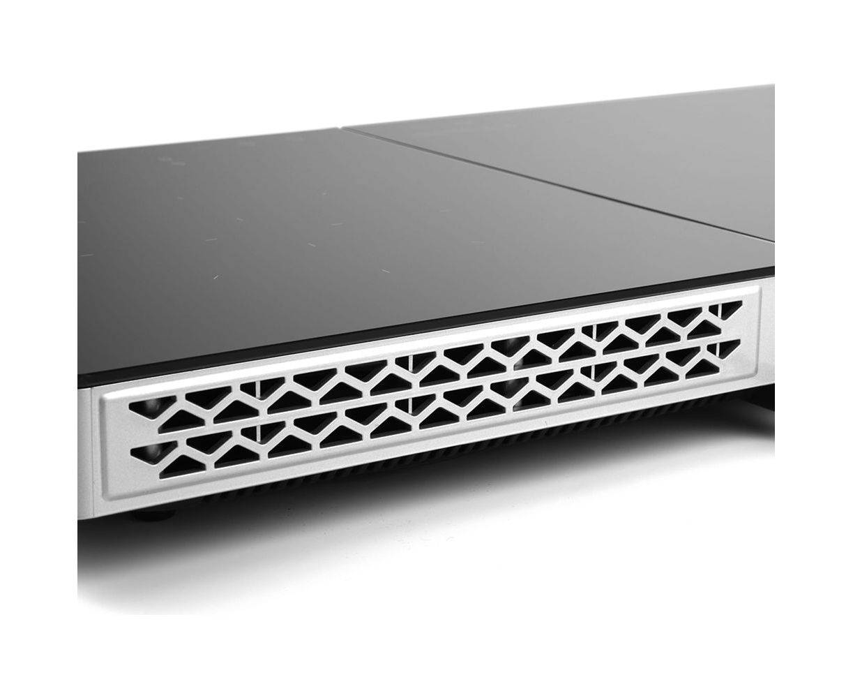 На обратной стороне плиты встроены вентилятор, который способствует быстрому охлаждению устройства во время интенсивной работы и после её завершения. Устройство оборудовано противоскользящими ножками, придающие плите устойчивое положение на поверхности.