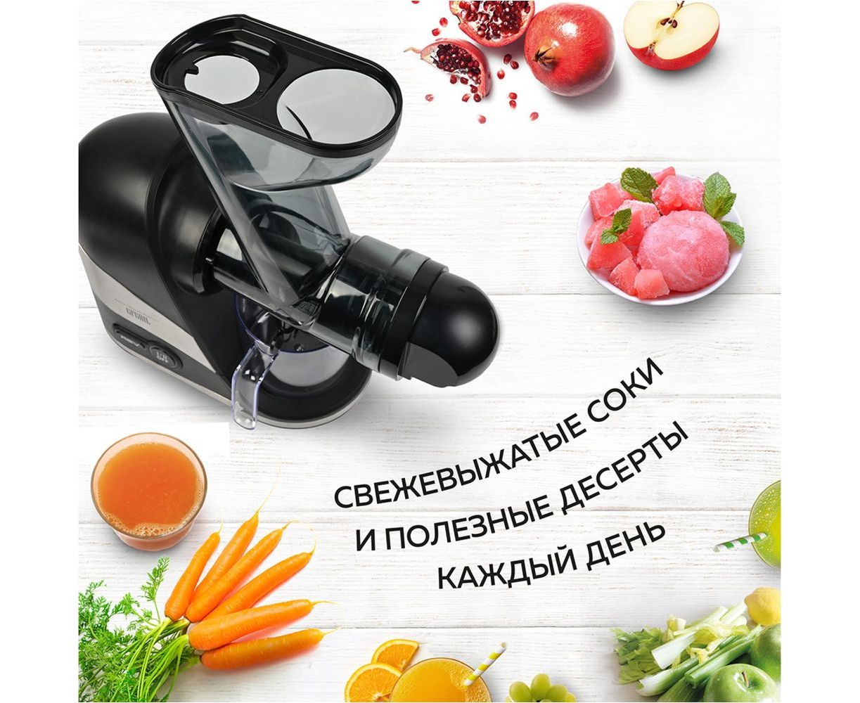 К преимуществам холодного отжима также можно отнести малошумную работу соковыжималки (< 60 дБ) и при этом высокую мощность 200 Вт.