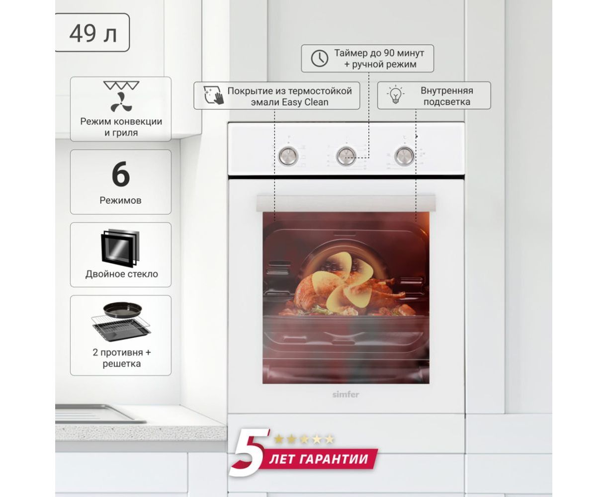Электрический духовой шкаф Simfer 6 режимов работы, конвекция B4EC18016 - современная техника для кухни, которая благодаря многообразию режимов, позволяет готовить не только повседневную пищу, но и изысканные блюда.