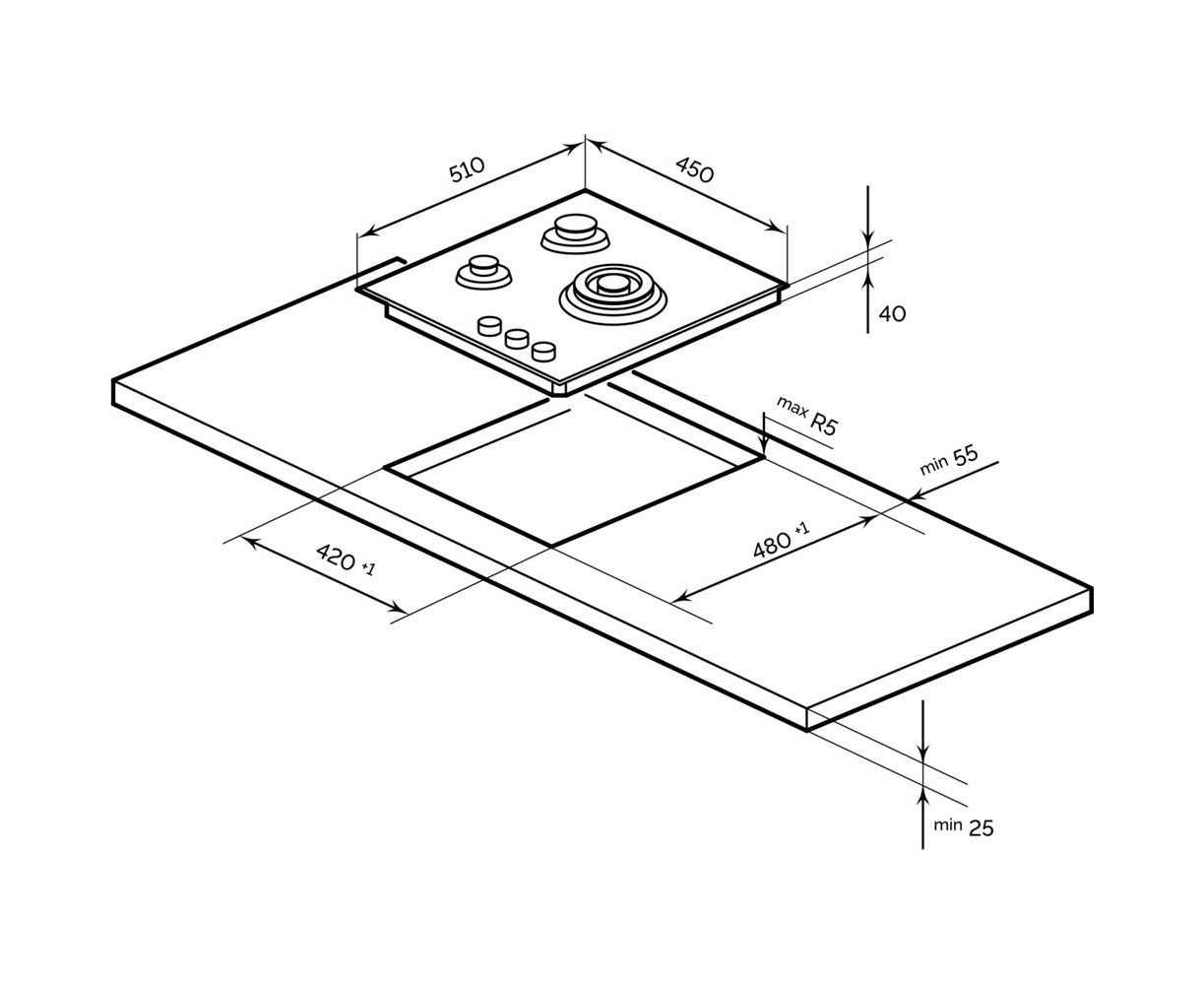 Имеет 3 конфорки, поэтому не занимает много места и подходит для небольшой кухни.