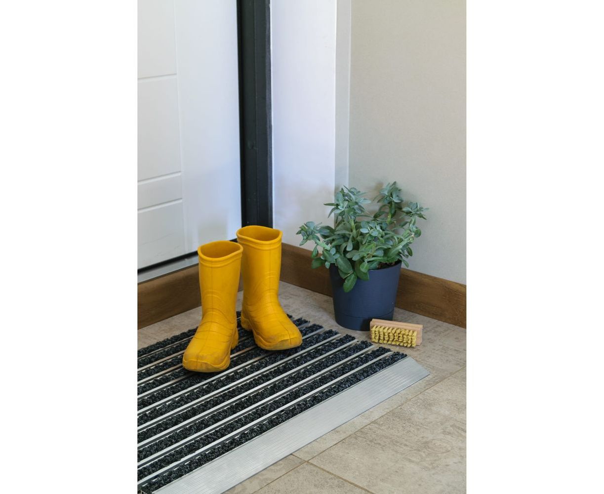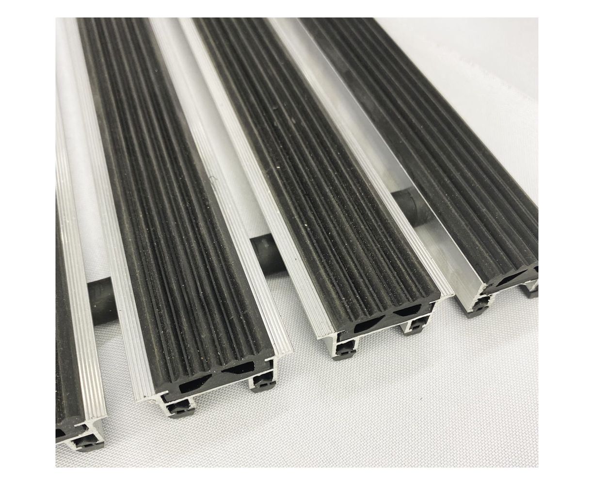 Состоит из резиновых вставок на несущих профилях из алюминия, которые стянуты тросом из нержавеющей стали в группу, образующую единую систему грязезащитной решётки.