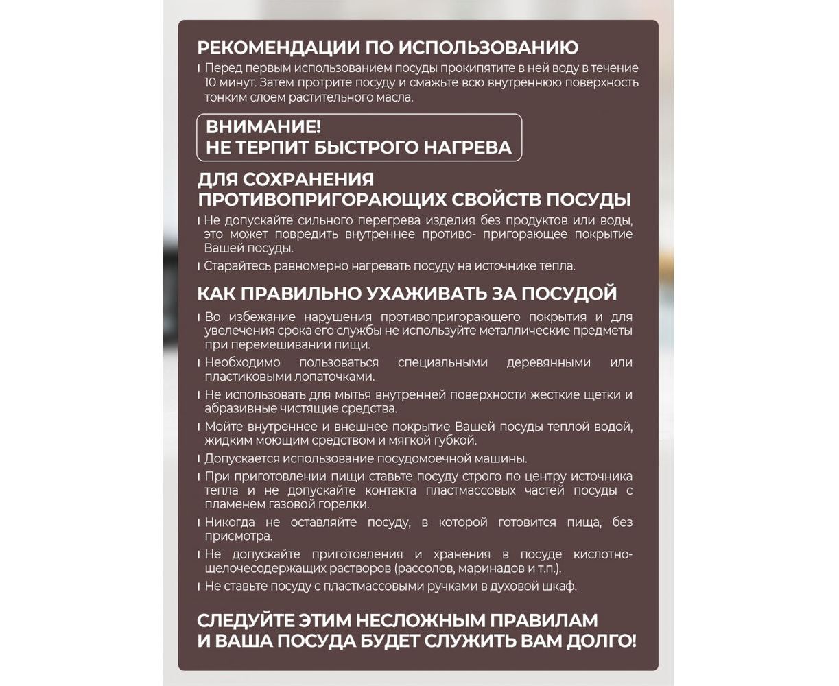 Антипригарное покрытие абсолютно безопасно для здоровья человека, не содержит PFOA. Высокая степень устойчивости к порезам и царапинам. Экономит электроэнергию благодаря быстрому нагреву. Подходит для газовых и электрических плит. Бакелитовая ручка не нагревается и обеспечивает надежный хват.