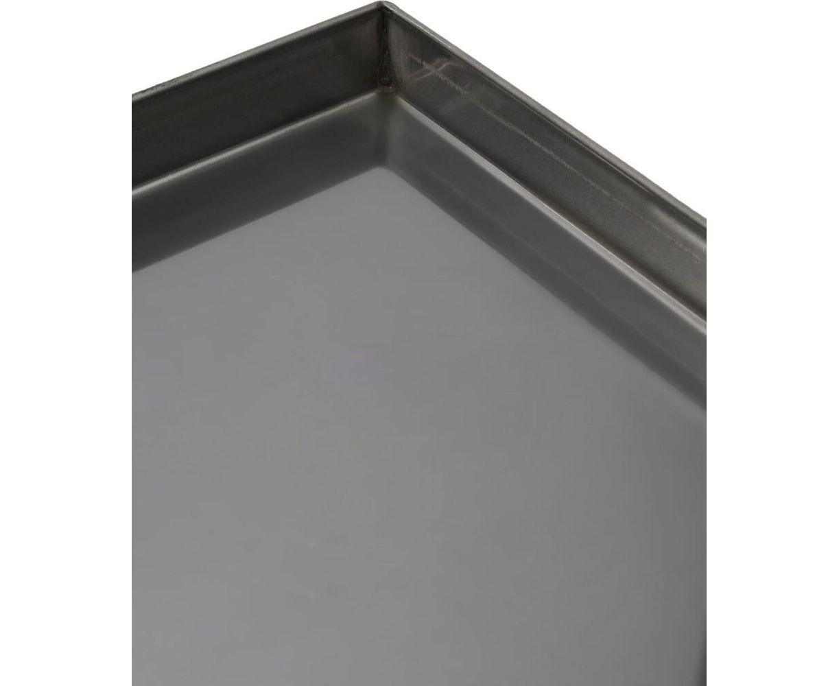 Противень имеет 4 борта, длина 600 мм, ширина 400 мм, высота борта 20 мм, борт 90 градусов. Противень с отбортовкой.