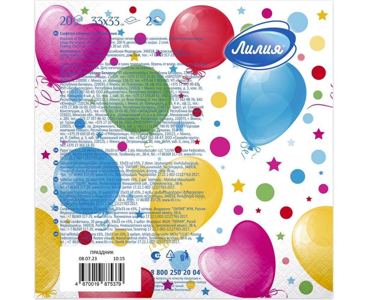 Бумажные салфетки Лилия 33x33, Праздник, 2 слоя, 20 листов 5379