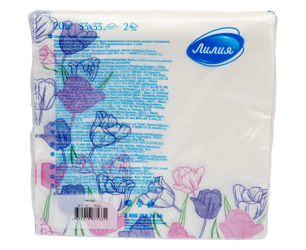 Салфетки бумажные 33x33 Melody 2слоя 20листов Лилия 5331