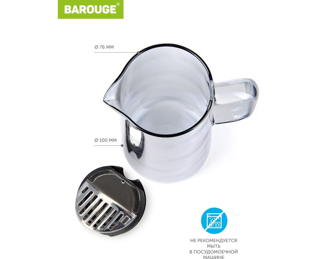Кувшин для воды BAROUGE BJ-702/24 стеклянный, серебристо-серый, 1400 мл BJ-702 1400 мл/кувшин выполнен из жаропрочного боросиликатного стекла. Способен выдержать температуру от -20 до +180 градусов. Таким образом в этом кувшине можно подавать как охлажденный лимонад с кубиками льда, так и любимый горячий чай