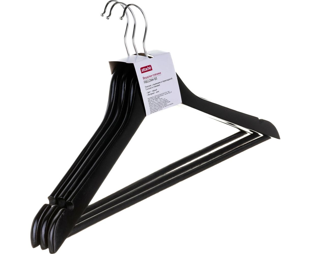Деревянная вешалка-плечики с выемками и перекладиной Attache черная, размер 48-50, 3 шт 808705 предназначена для хранения вещей в гардеробе и шкафу.