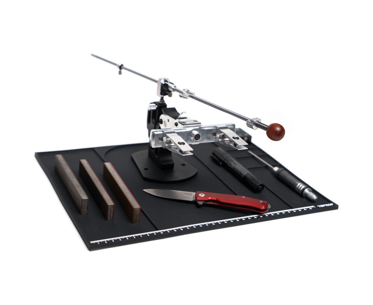 Во время заточки коврик обеспечивает чистоту рабочего места, что особенно важно при работе в жилых помещениях. Он легко промывается и не впитывает жидкость, противостоит воздействию масел, средств для чистки абразивов, а также заточного шлама. Помимо отсека для установки заточного устройства, в нем имеются отсеки для салфеток, инструментов, емкости с маслом для заточки, а также хранения электронного угломера Axicube One.