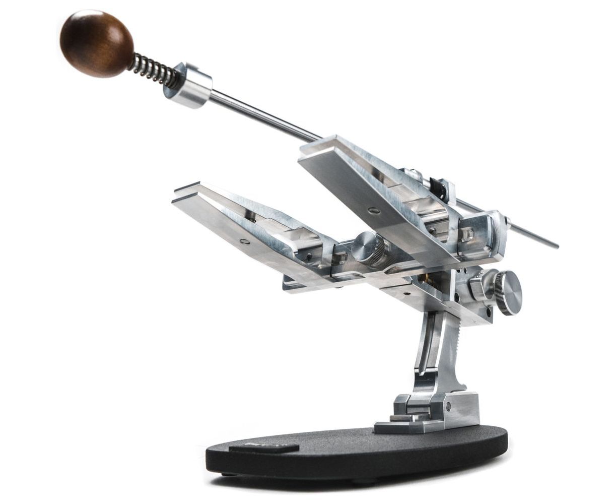 Поворотный механизм точилки помогает сохранить одинаковый угол заточки на обеих сторонах ножа. После переворота рычаг намертво фиксирует рамку с зажимами. Вращением ручки подъема, поворотный узел плавно движется вокруг виртуального центра, в котором находится режущая кромка ножа. Дуговая стойка изготовлена из единого куска алюминия и интегрирована с реечным подъемником с зубчатым зацеплением. Стопорный рычаг, после настройки необходимого угла, позволяет надежно зафиксировать крепление поворотного узла.