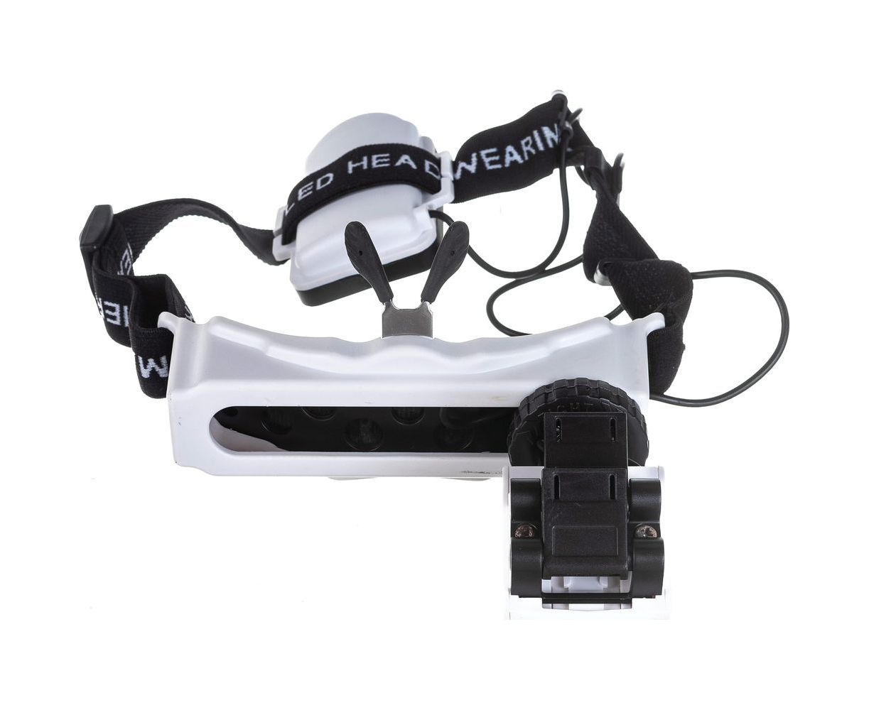 Лупа налобная со сменными стеклами-насадками и гибким фиксатором (широкая резинка) на голове.Увеличение: 1.0X, 1.5X, 2.0X, 2.5X, 3.0X, 3.5X, 4.0X, 4.5X, 5.0X, 5.5X, 6.0X, 8.0X, 13.0X, 20.0X, 25.0X, 28.0X.5 сменных пластиковых стекол-насадок и 3 бинокулярные линзы в комплекте могут быть установлены попарно и дают до 16 шагов увеличения.Светодиодная подсветка (1 суперяркий светодиод) позволяет работать в условиях недостаточной освещенности.Подобная налобная лупа незаменима для слабовидящих людей при чтении, работе с мелкими предметами.Лупа позволяет не занимть руки и рассматривать предметы на разной кратности (сменные линзы).Сферы применения такой лупы обширны: чтение, радиотехнические и ювелирные работы, часовые работы, медицина. Характеристики: Увеличение – 1.0X, 1.5X, 2.0X, 2.5X, 3.0X, 3.5X, 4.0X, 4.5X, 5.0X, 5.5X, 6.0X, 8.0X, 13.0X, 20.0X, 25.0X, 28.0X.Габариты – 140х110х35мм.Вес без батареек – 70 г.Материал – пластик.Питание – 3 батарейки LR03 (AAA) (мизинчиковые, в комплект не входят).Подсветка – 1 суперяркий светодиод.Страна-производитель – Китай.Незаменимый инструмент для тех, кому нужно разглядеть мелкие детали изображения или текста.
