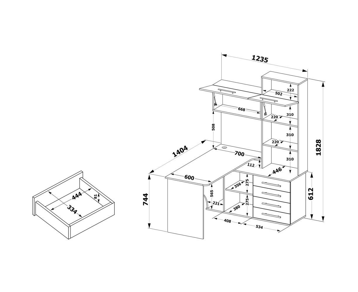 Модель сочетает в себе широкий компьютерный стол с размером столешницы 1400 мм, тумбу с ящиками, полками и нишей под системный блок. Высокая надстройка имеет открытые полки и два закрытых шкафа. Двери шкафчиков открываются вверх. Внутренний размер ящиков — 456х346 мм.