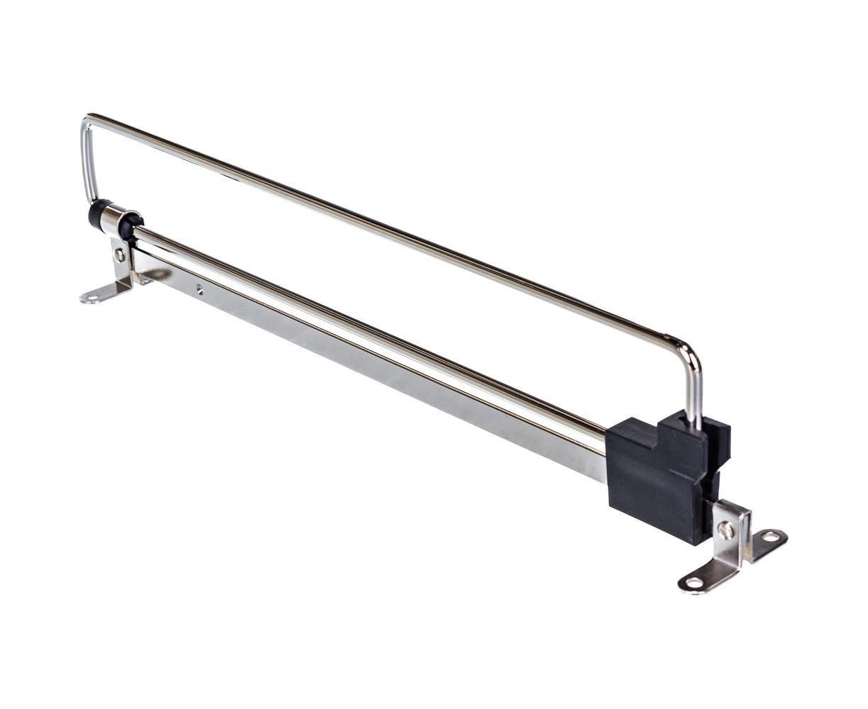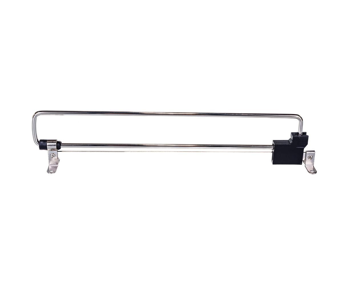 Выдвижная штанга для одежды применяется в неглубоких шкафах, глубиной от 25 до 50 см. Удобство заключается в перпендикулярном расположении штанги относительно дна шкафа. одна часть выдвигается, позволяя человеку взять необходимую вещь. Фиксируется к потолку гардероба.