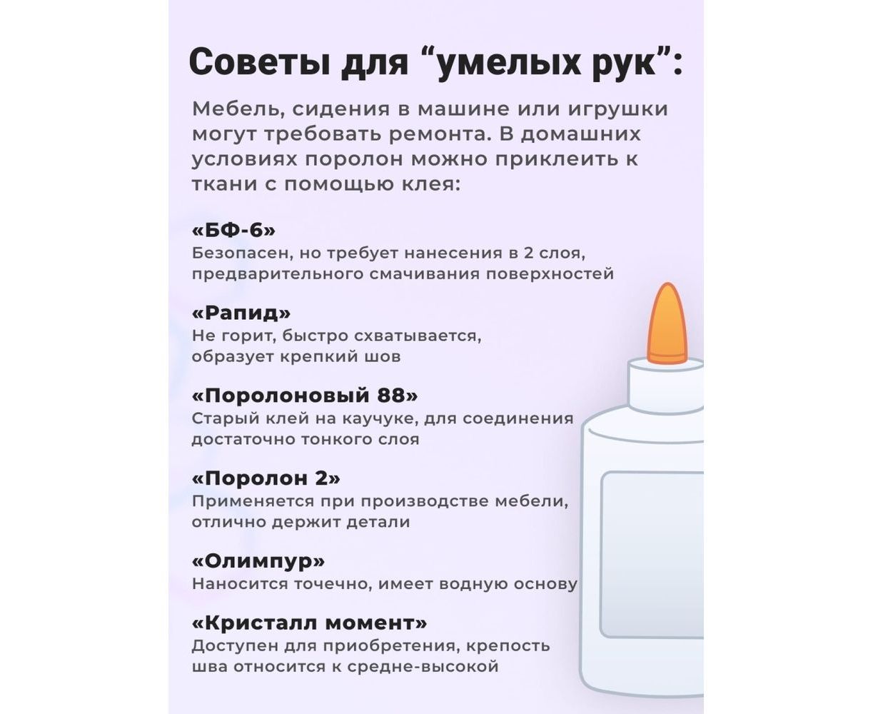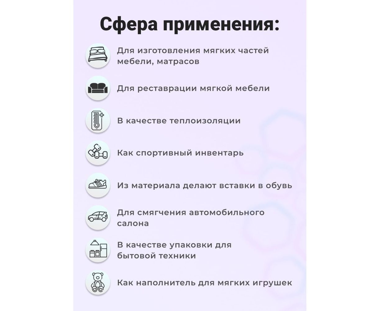 Эластичный пенополиуретан или же поролон, придает упругость изделиям и используется в качестве смягчающего или опорного материала. От плотности мебельного наполнителя зависит сохранение формы мебельного изделия, именно поэтому в качестве наполнителя идеально подходит поролон. Использованный поролон можно применять повторно, при этом качество листа не изменяется. Также ППУ можно использовать в качестве уплотнителя при строительных работах. Он выполняет функцию протектора конструкций от механических повреждений. Поролон используют при изготовлении сидений диванов, кресел, банкеток и пуфиков. В настоящее время трудно представить себе мягкую и комфортную мебель без мебельного наполнителя. Важно знать, что поролон в заводской упаковке находится в сжатом виде, поэтому перед началом работ нужно дать распакованному листу отлежаться и принять свою истинную форму.