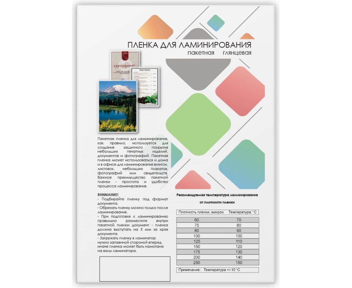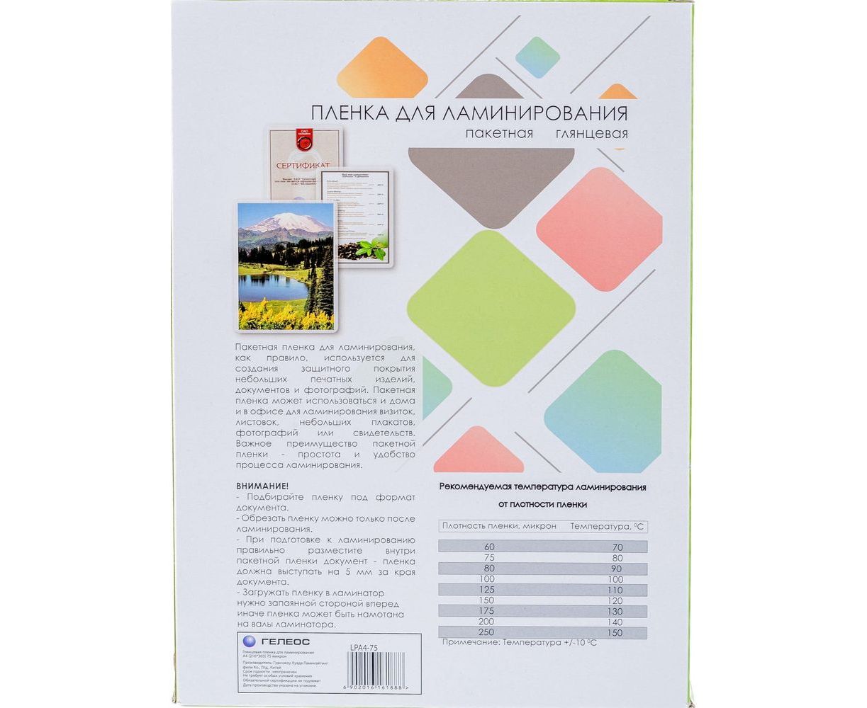Пленка-заготовка ГЕЛЕОС A4, 216х303, 75 мкм, глянцевая, 100шт LPA4-75 подходит под формат листа А4.