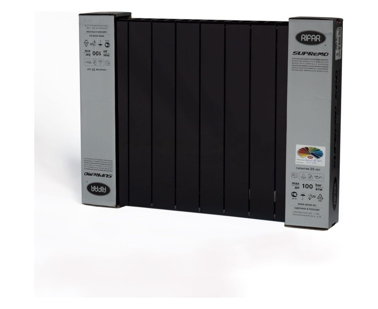 Биметаллический радиатор RIFAR 67 SUPReMO 500-10, Ду 3/4, антрацит R S500103/49005 предназначен для обогрева помещений жилого, офисного и административного назначения. Включает 10 секций, мощности прибора хватает, чтобы отопить 20.2 квадратных метра.