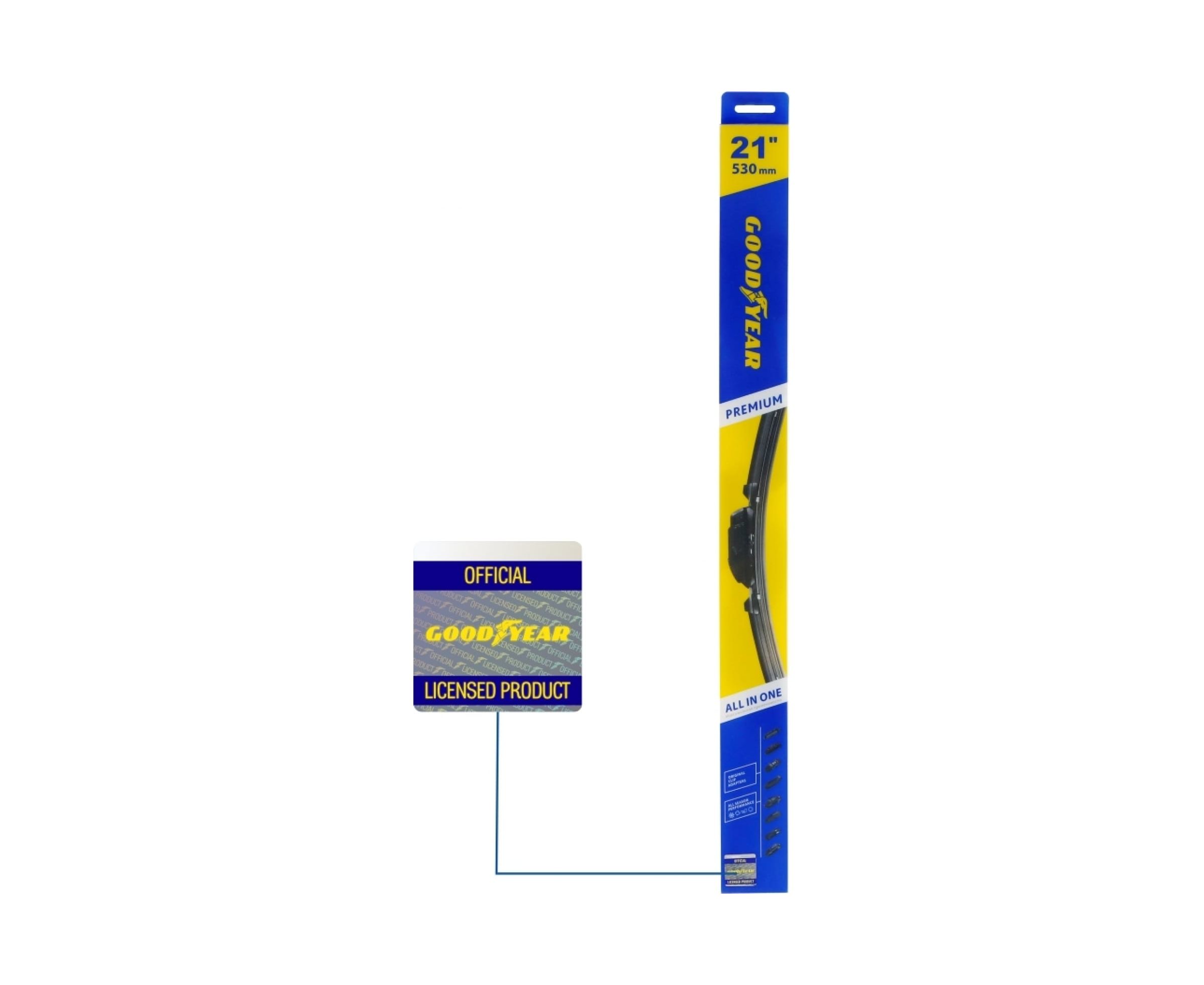 Бескаркасная щетка Goodyear PREMIUM 21/53 cm GY000441. Применимость до 99,8% автомобилей в России. Уникальная система крепления Clip Adapters. Симметричный аэродинамический спойлер. Дополнительные направляющие из нержавеющей стали. Резиновое лезвие класса ААА. Графитовое покрытие. Всесезонность.