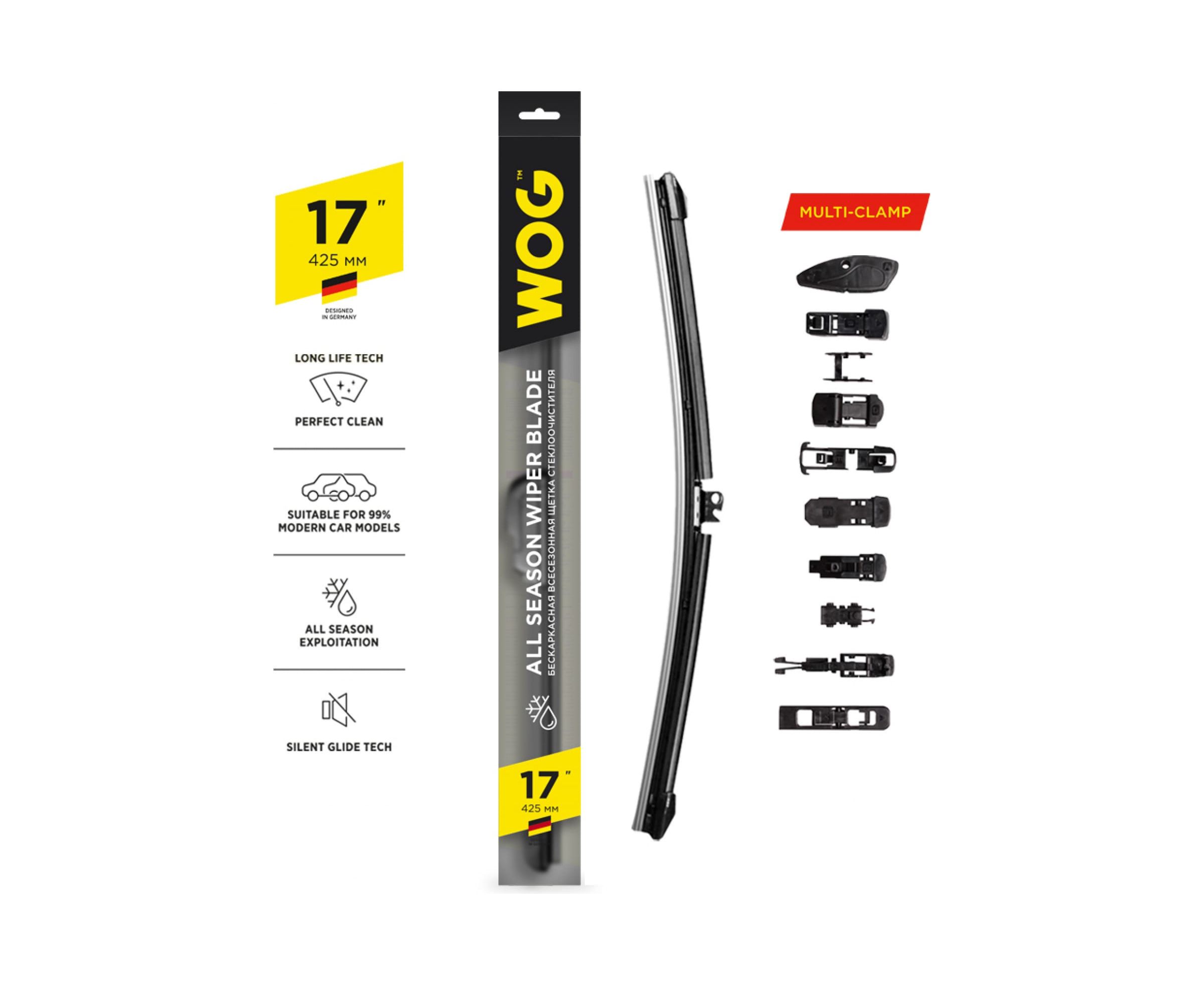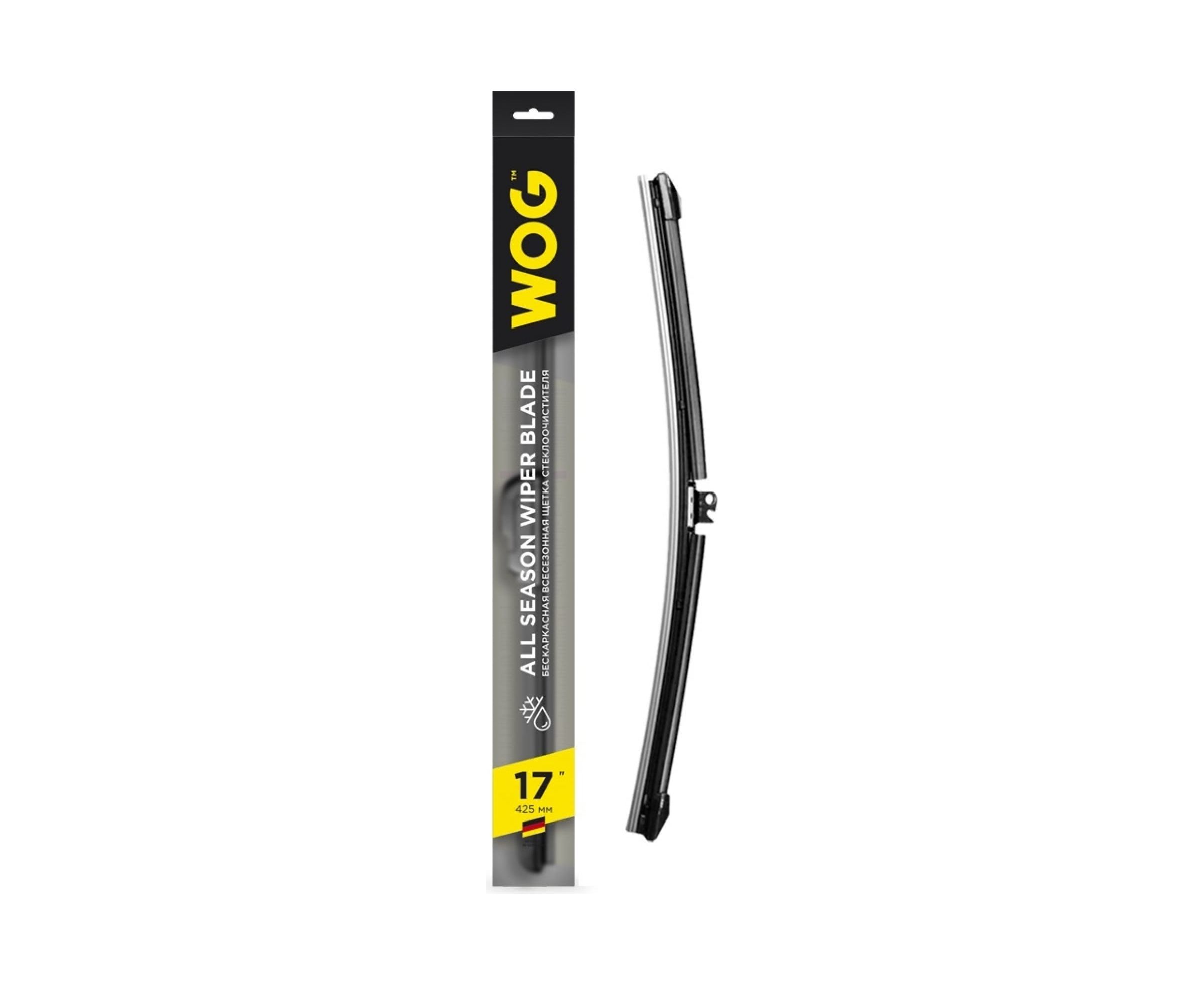 Щетка стеклоочистителя всесезонная бескаркасная бесшумная 17"/425 мм с адаптерами WOG WGC1403