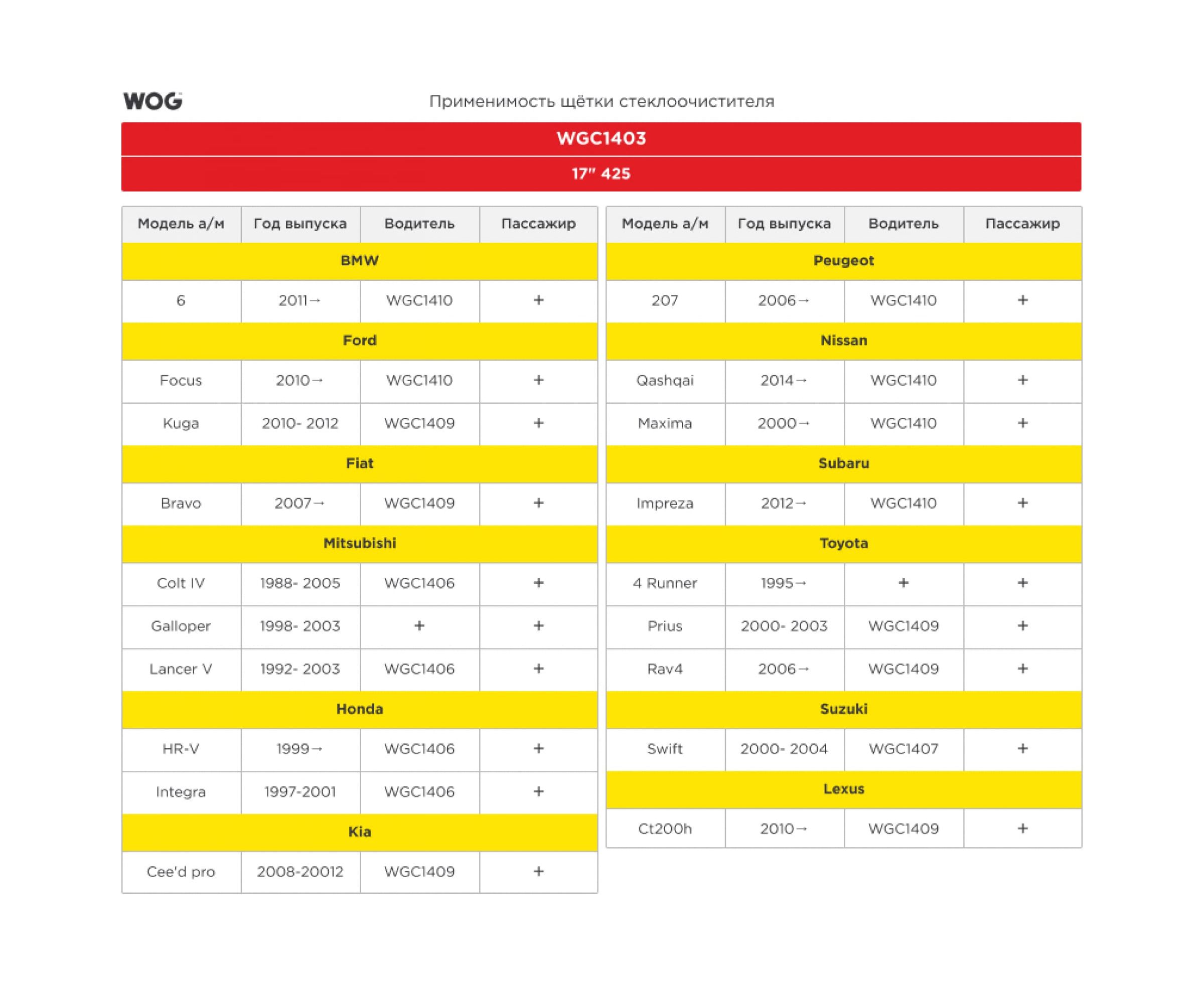 Щетка стеклоочистителя всесезонная бескаркасная бесшумная 17"/425 мм WOG WGC1403 выполнена по технологии «long life tech» и предназначена для круглогодичного использования. За счет плотных обтекателей щетка плотно прилегает к стеклу, тщательно очищает и не оставляет полос и разводов. За счет применения композиционной технологии «silent glide tech» достигается легкое скольжение щетки по стеклу, без посторонних звуков и зависаний щетки. Мягкий кожух щетки не промерзает и позволяет очистить ее от наледи без потери функциональных свойств.