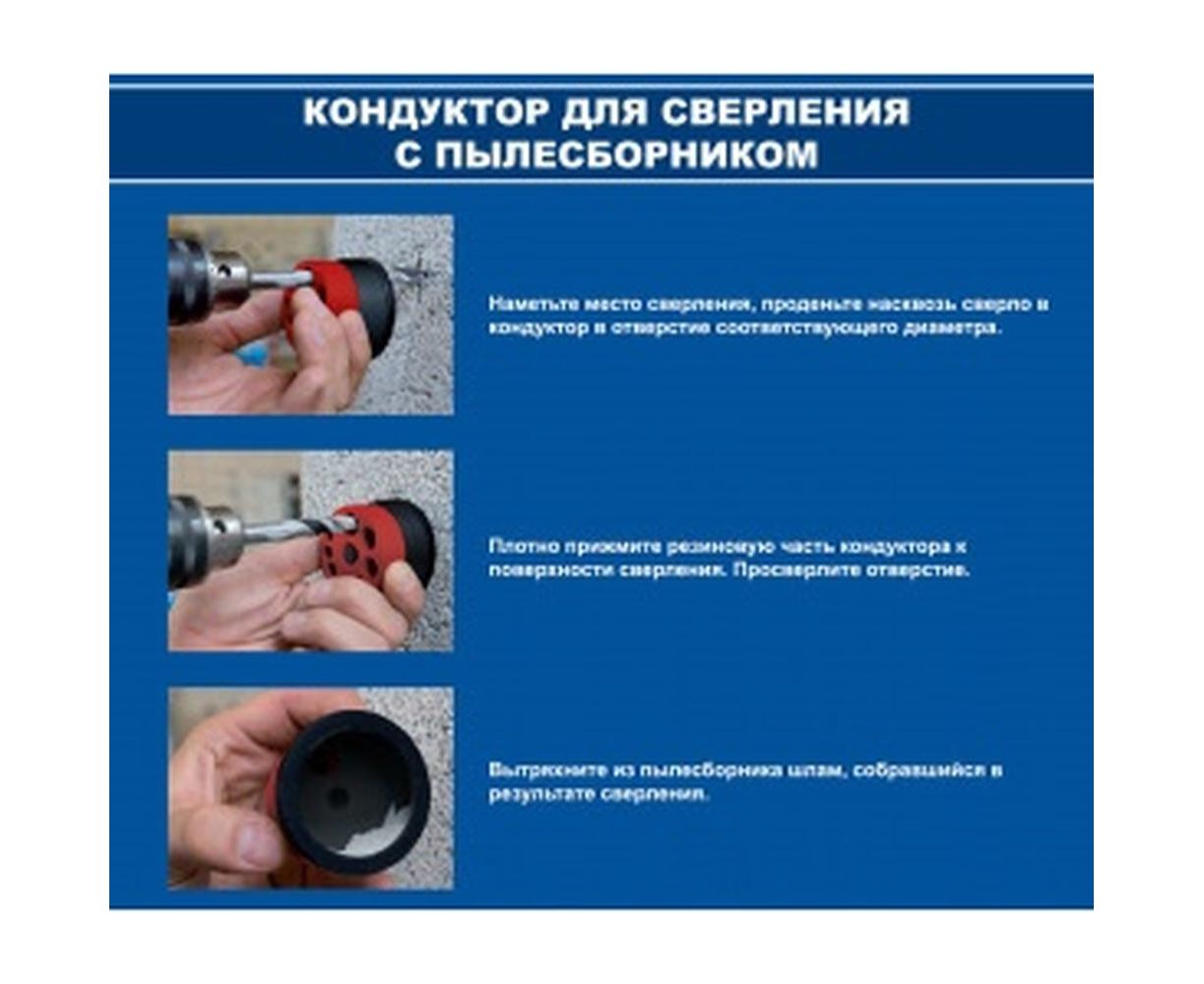 Кондуктор ПРАКТИКА 247-026 предназначен для аккуратного сверления различных материалов с помощью спиральных сверл и буров диаметрами 4, 5, 6, 7, 8, 9, 10 мм. Оснастка имеет специальный резиновый обод для сбора пыли и стружки из отверстия. Кондуктор эффективен при выполнении работ в уже отделанных помещениях при сверлении вертикальных, наклонных поверхностей стен, а также потолков.
