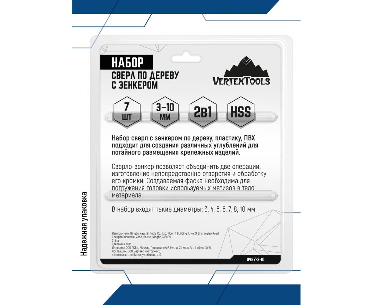 Набор сверл по дереву с зенкером 8 предметов vertextools 0987-3-10