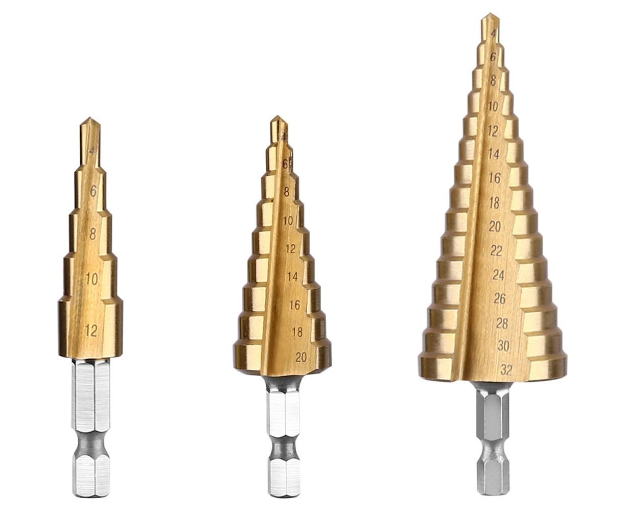 Набор сверл ступенчатых DH2 3 шт, 4-12 мм, 4-20 мм, 4-32 мм DEKO 065-0689 подходят для сверления отверстий в изделиях из цветных металлов, пластика и стальных листах.