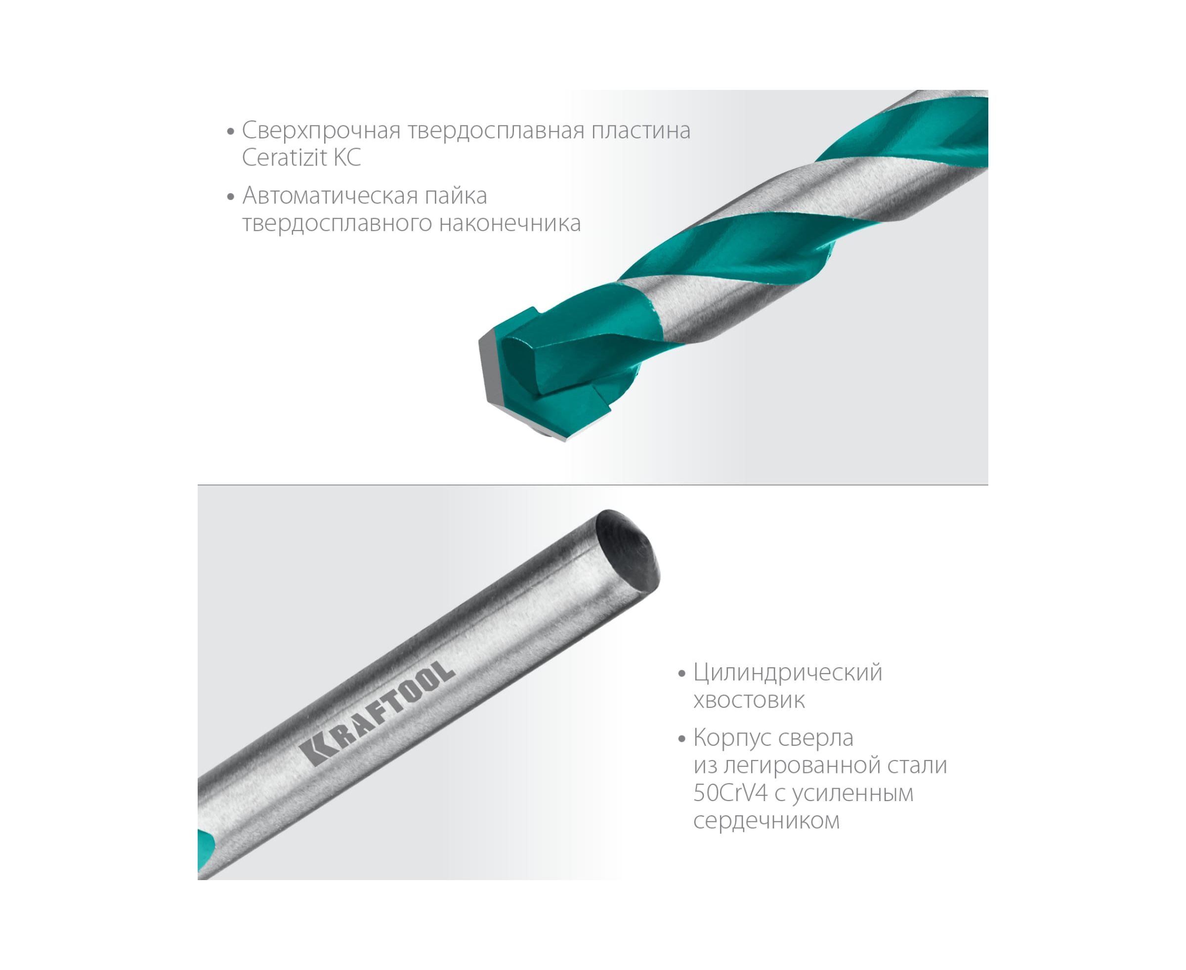 Благодаря специальной твердосплавной пластине и алмазной заточке режущих кромок свёрла из набора KRAFTOOL Keramo 29175-H5 уверенно проходит через керамогранит, мрамор, гранит и прочие твердые материалы.