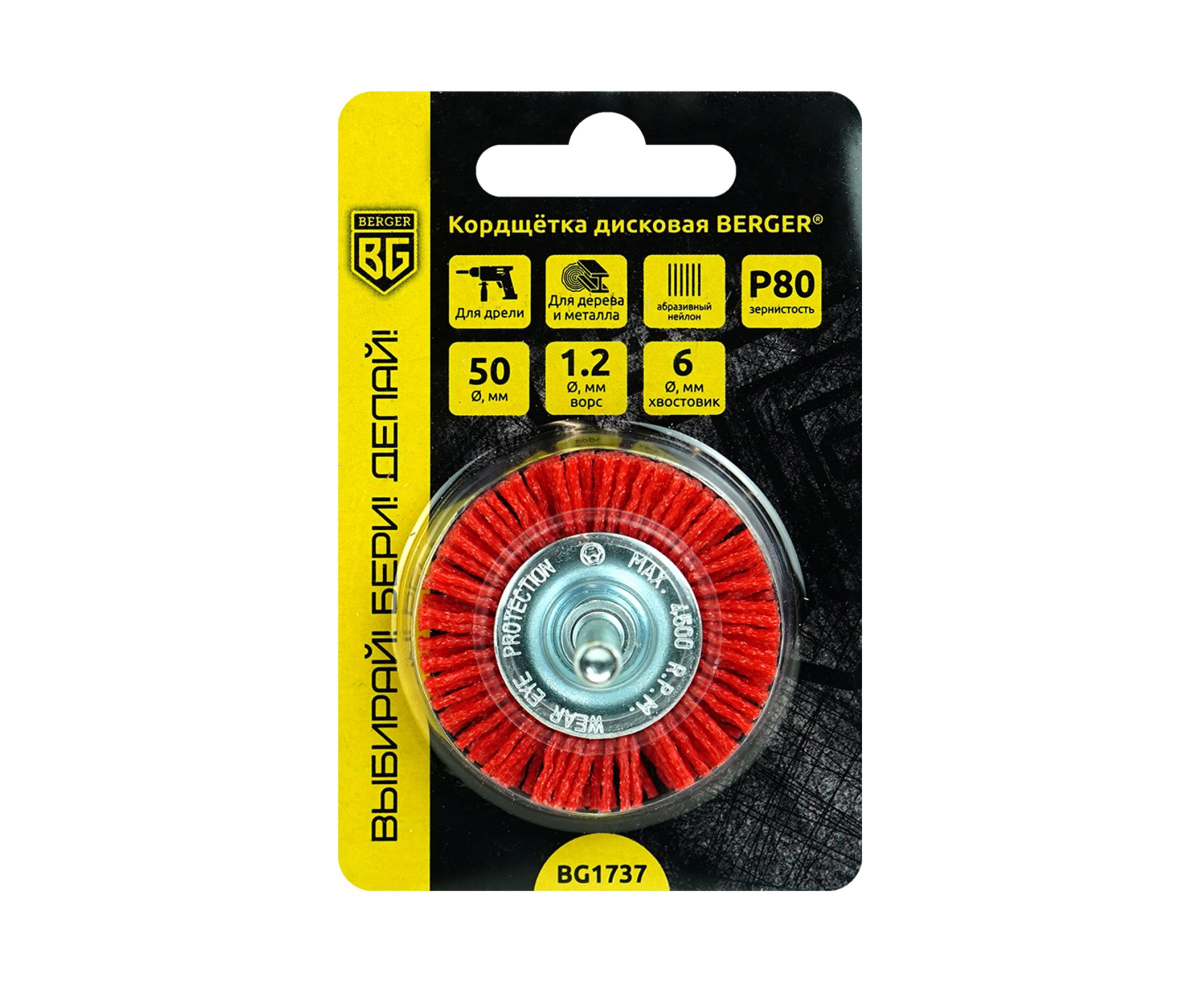 Кордщётка дисковая 50 мм, абразивный нейлон 1.2 мм, P80, хвостовик 6 мм Berger BG BG1737