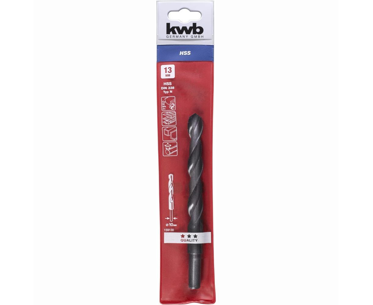 Сверло по металлу HSS 13 мм, уменьшенный хвостовик kwb 159130, тип N, изготовлено методом роликовой прокатки, цвет иссиня-чёрный, отпущенное паром, угол острия 118°, уменьшенный хвостовик, для установки свёрл больших диаметров в стандартные электродрели, для обработки легированной и нелегированной стали, серого чугуна, цветных металлов, твёрдых пластиков.
