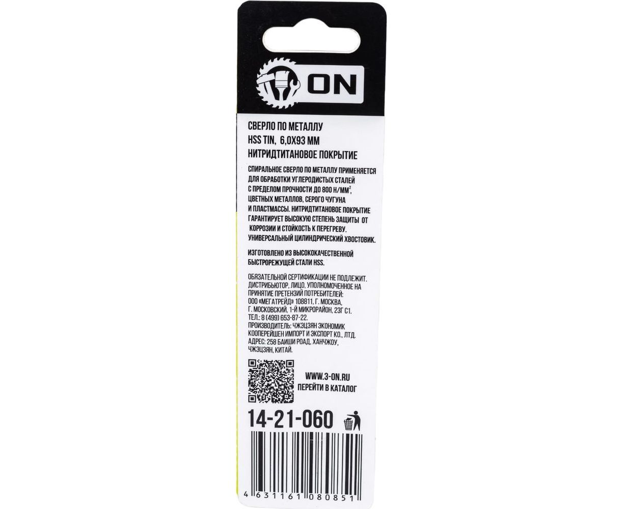 Сверло по металлу HSS TIN 6x93 мм, нитридтитановое покрытие On 14-21-060
