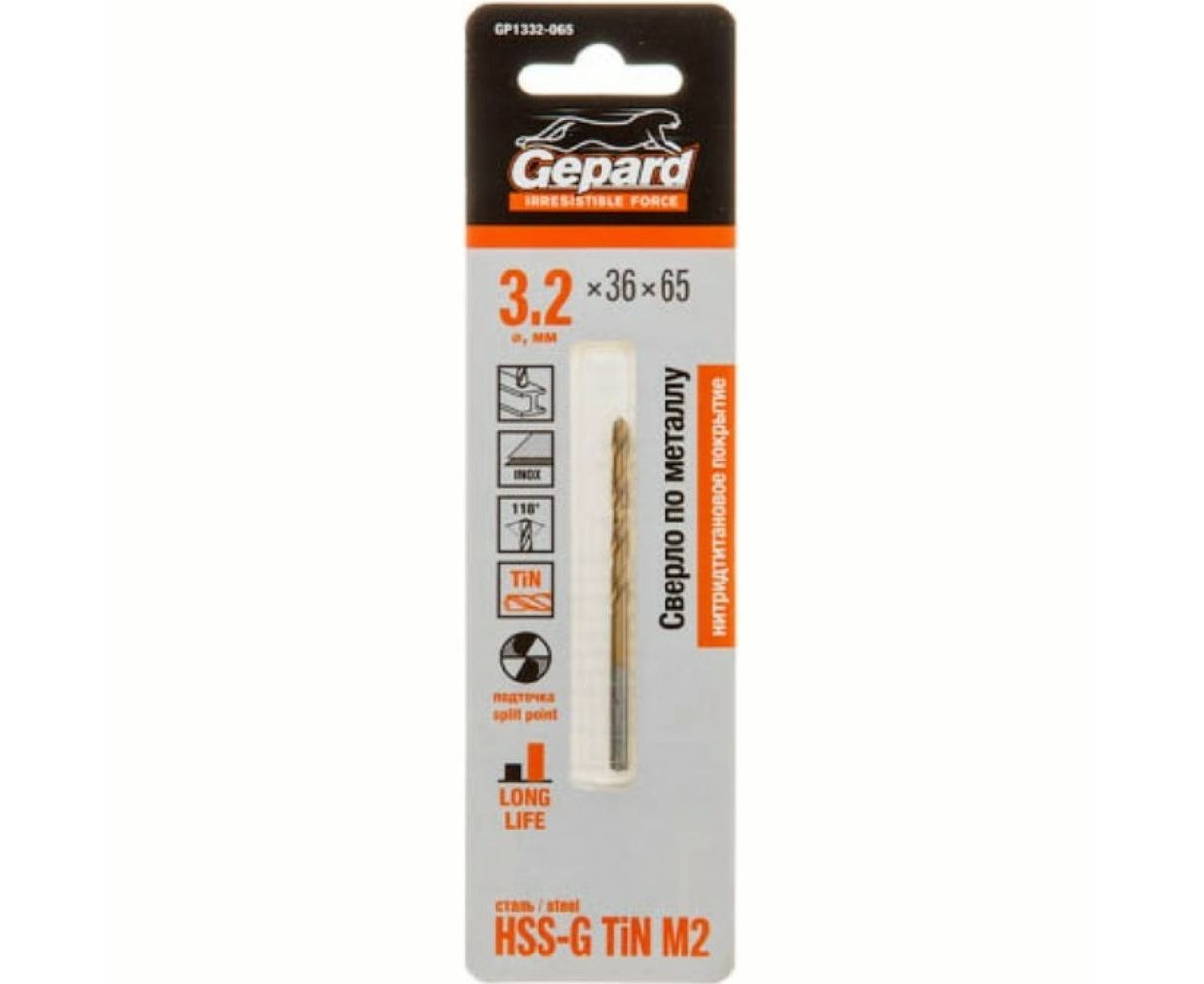 Сверло спиральное по металлу 3.2x36x65 мм, HSS TIN Gepard GP1332-065 предназначено для сверления отверстий в конструкционных углеродистых и легированных сталях, цветных металлах, чугуне, бронзе, медно-никелевых сплавах, графите, твердом пластике.