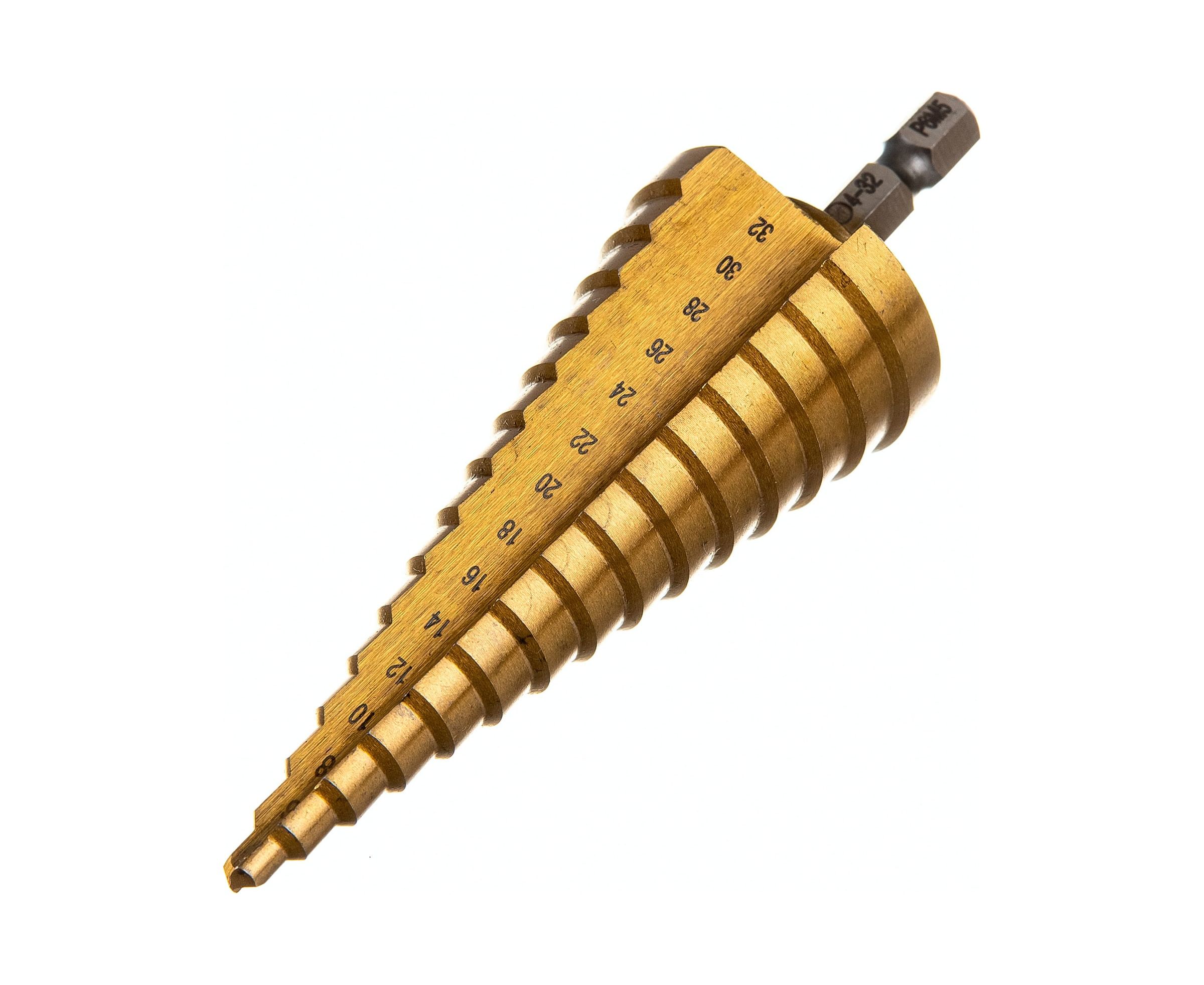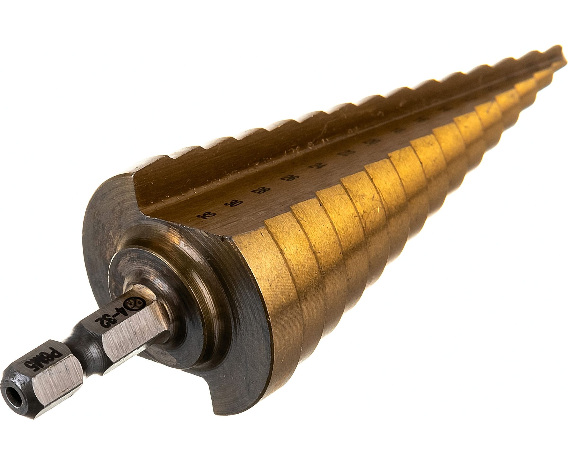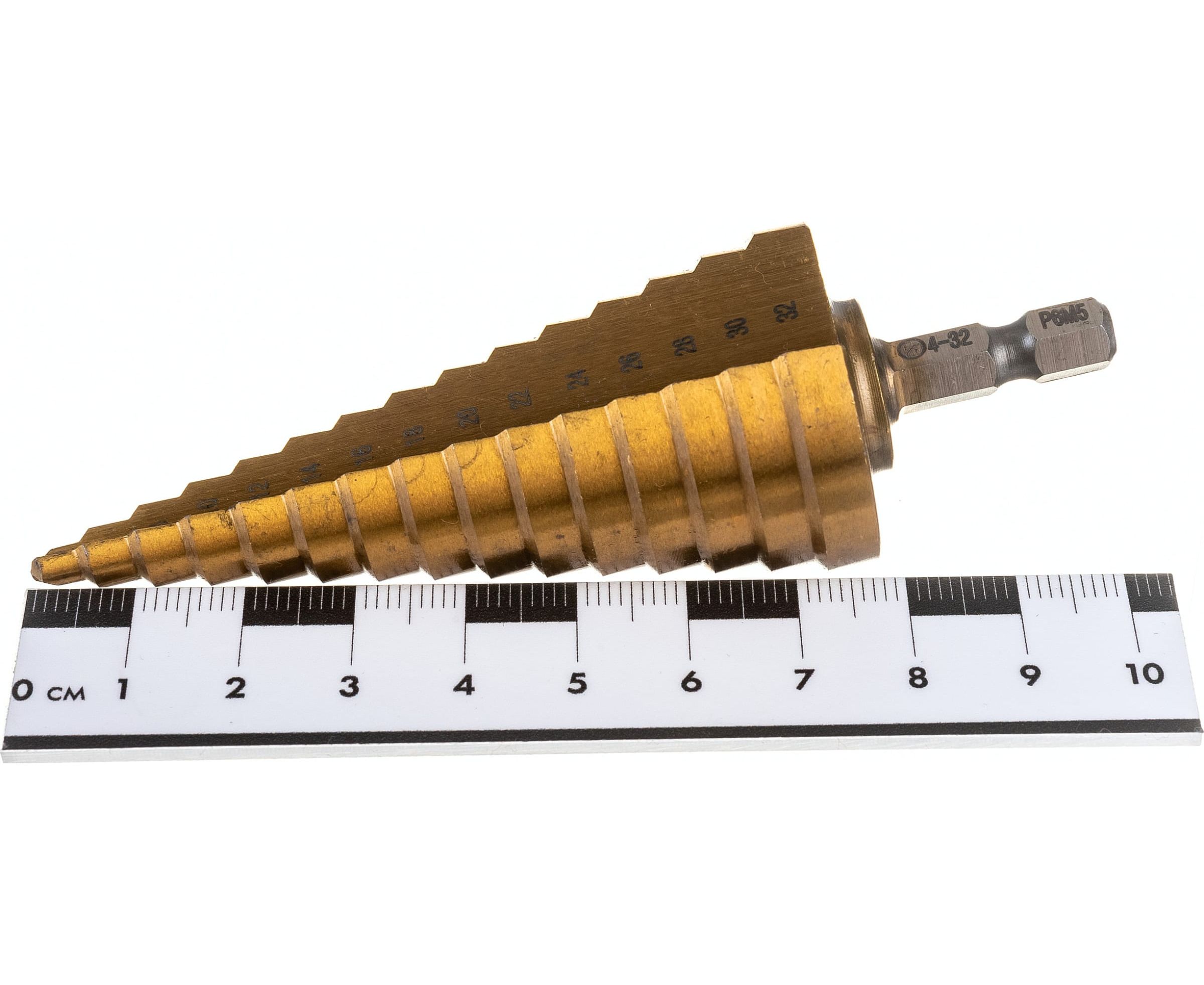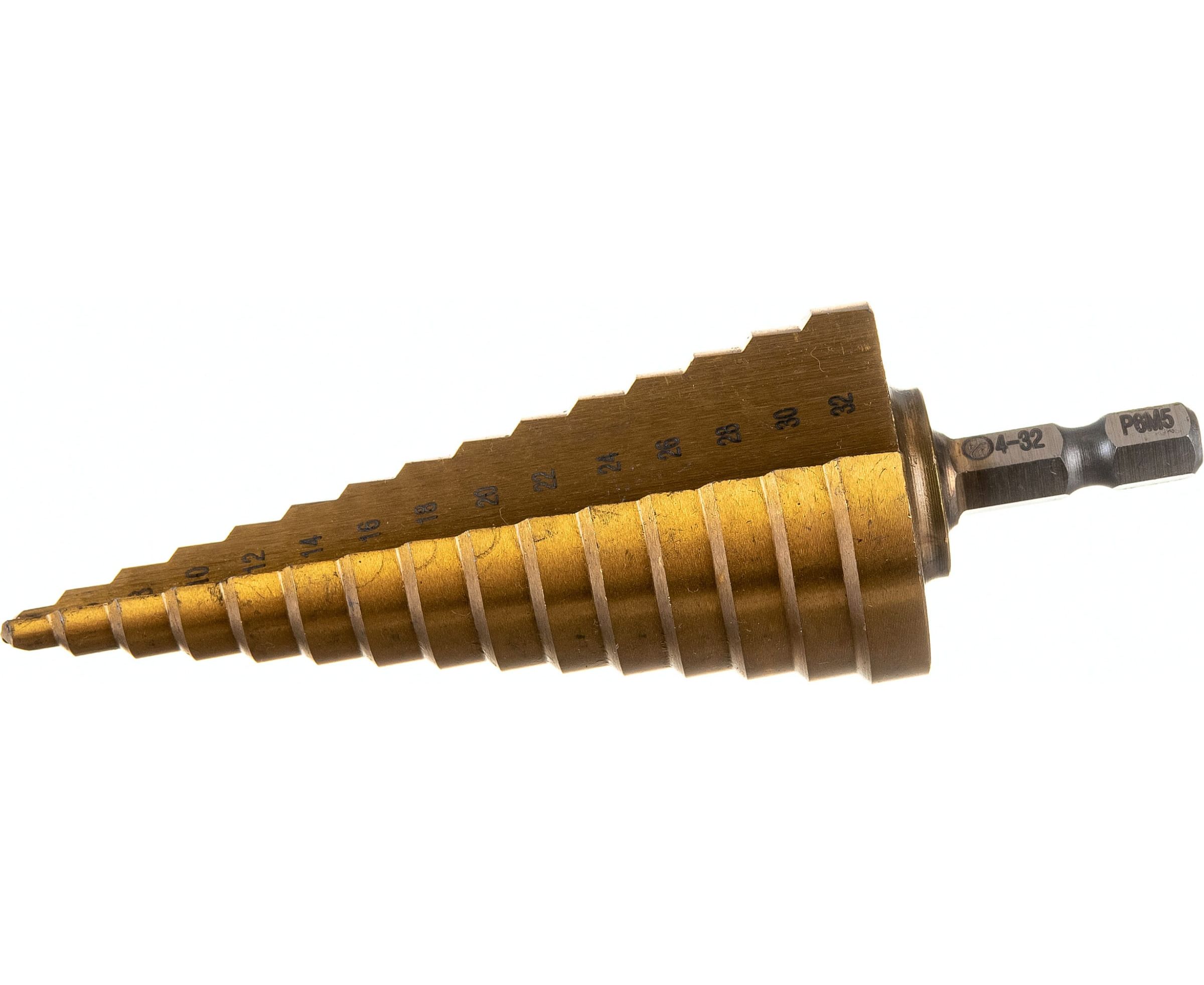 Сверло ступенчатое 4-32 мм, 15 размеров Резолюкс 31403 из износостойкого покрытия нитрида титана, сталь Р6М5. Применяется для последовательного рассверливания и правки отверстий в листовой стали, цветных металлах и пластике.