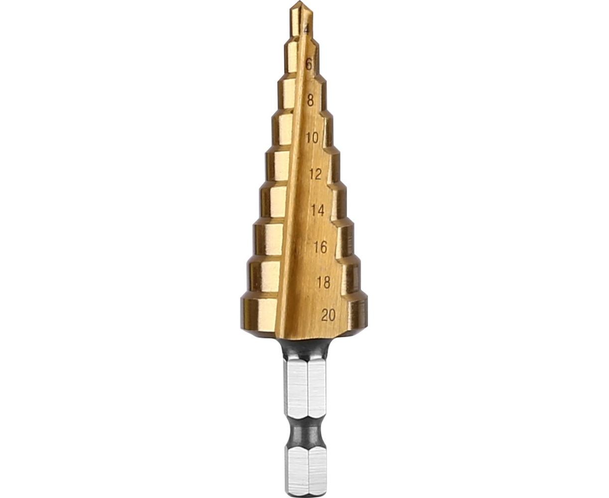 Сверло ступенчатое DH23 4-20 мм DEKO 065-0691 изготовлено из быстрорежущей стали (HSS) с покрытием из нитрида титана для увеличения срока службы, теплоотведения при интенсивных и повышенных нагрузках.