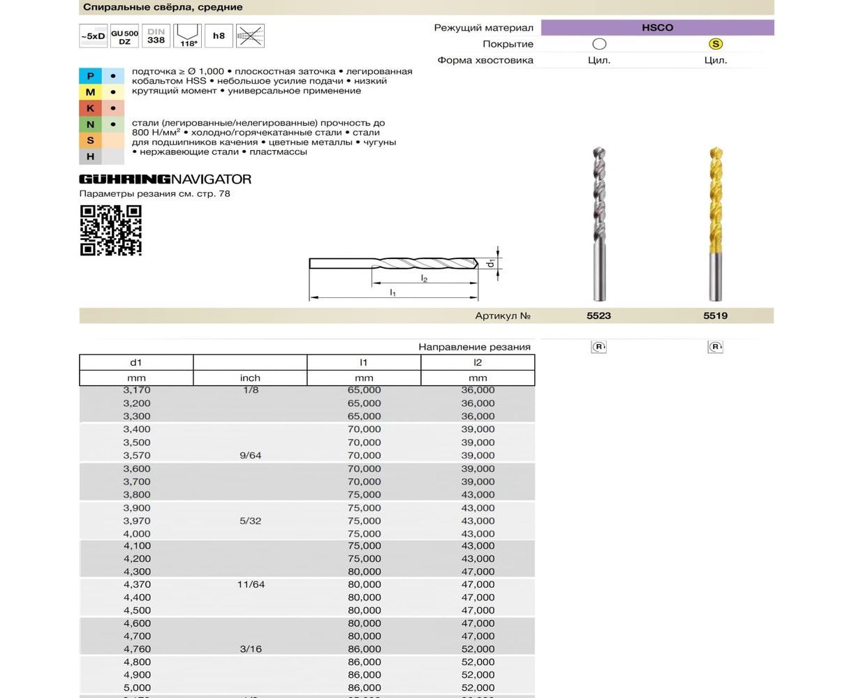 Сверло тип GU500DZ (3.4 мм, HSCO, без покрытия) Guhring 5523 3,400