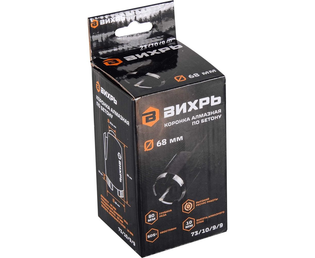 Коронка алмазная по бетону Вихрь 68 мм, SDS-Plus - это инструмент, предназначенный для профессиональной работы с бетоном и другими твердыми материалами. Она обладает высокой прочностью и долговечностью благодаря использованию алмазного напыления на своей рабочей поверхности.