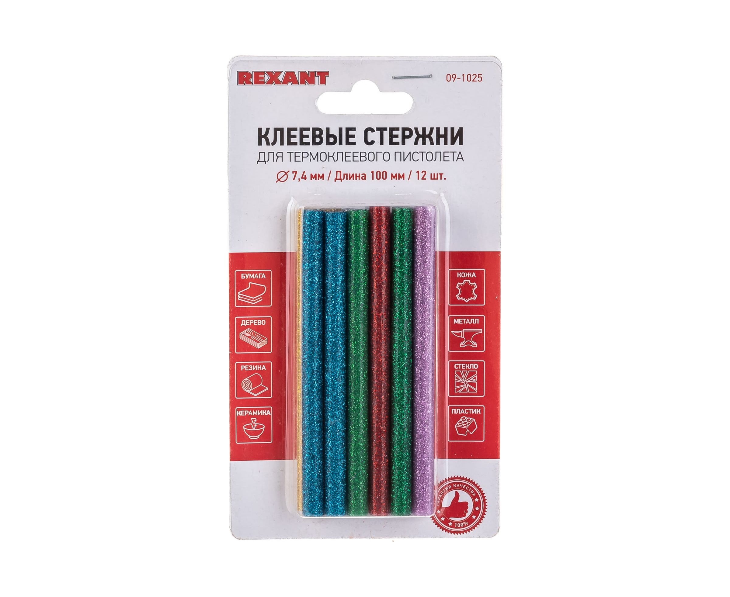 Клеевые стержни (d=7,4 мм, L=100 мм, цветные с блестками, 12 шт.) Rexant 09-1025