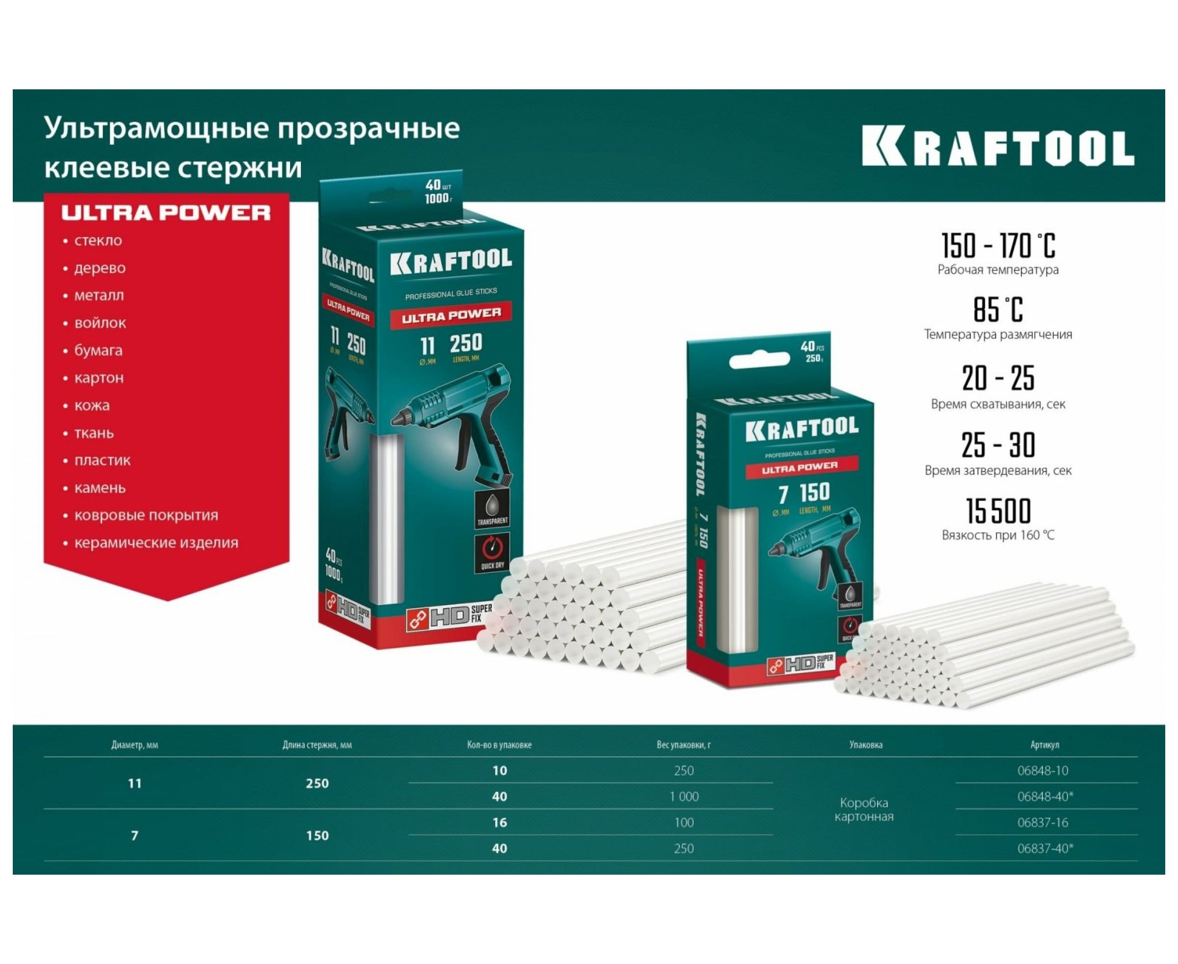 Ультрамощные прозрачные клеевые стержни KRAFTOOL Ultra Power 40 шт, 11x250 мм 06848-40 - универсальные клеевые стержни со специальным составом обеспечивающим надежное соединение после застывания.