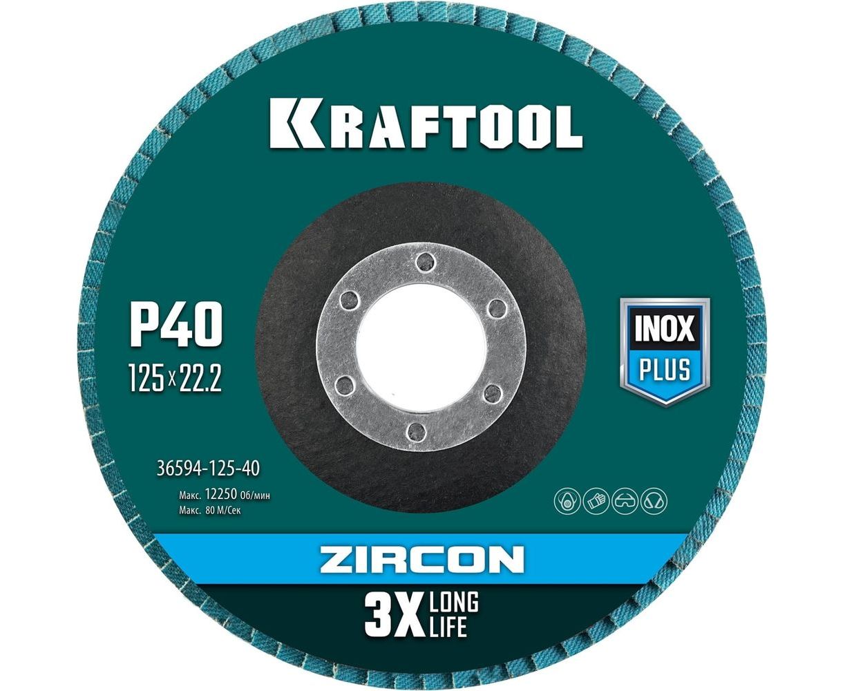 Лепестковый циркониевый торцевой круг KRAFTOOL ZIRCON Inox-Plus по металлу и нержавеющей стали, 125x22.2 мм, P40 36594-125-40