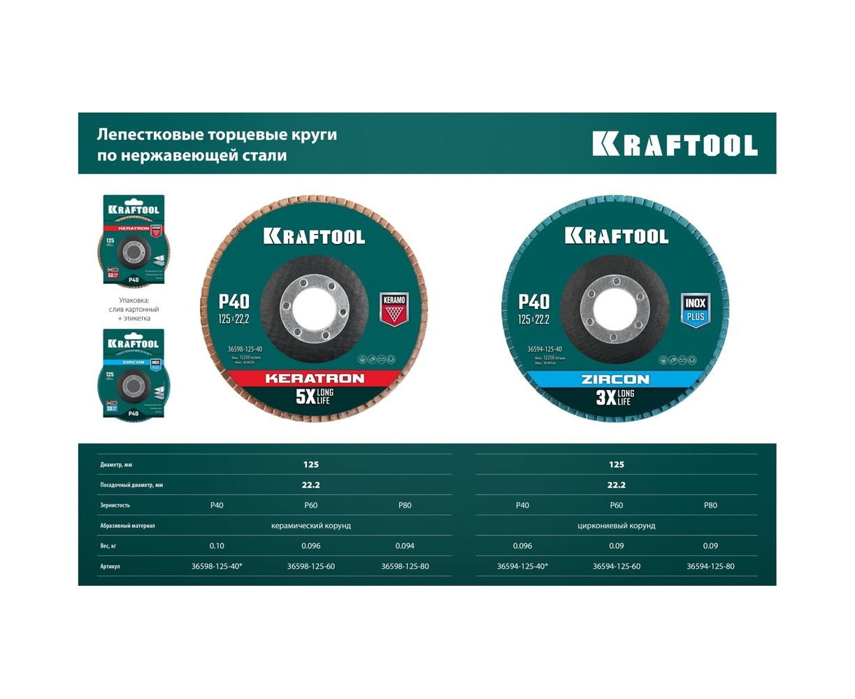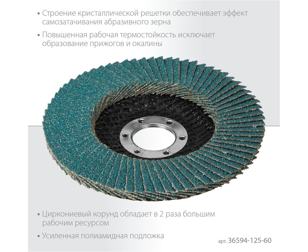 Лепестковый циркониевый торцевой круг KRAFTOOL ZIRCON Inox-Plus по металлу и нержавеющей стали, 125x22.2 мм, P60 36594-125-60