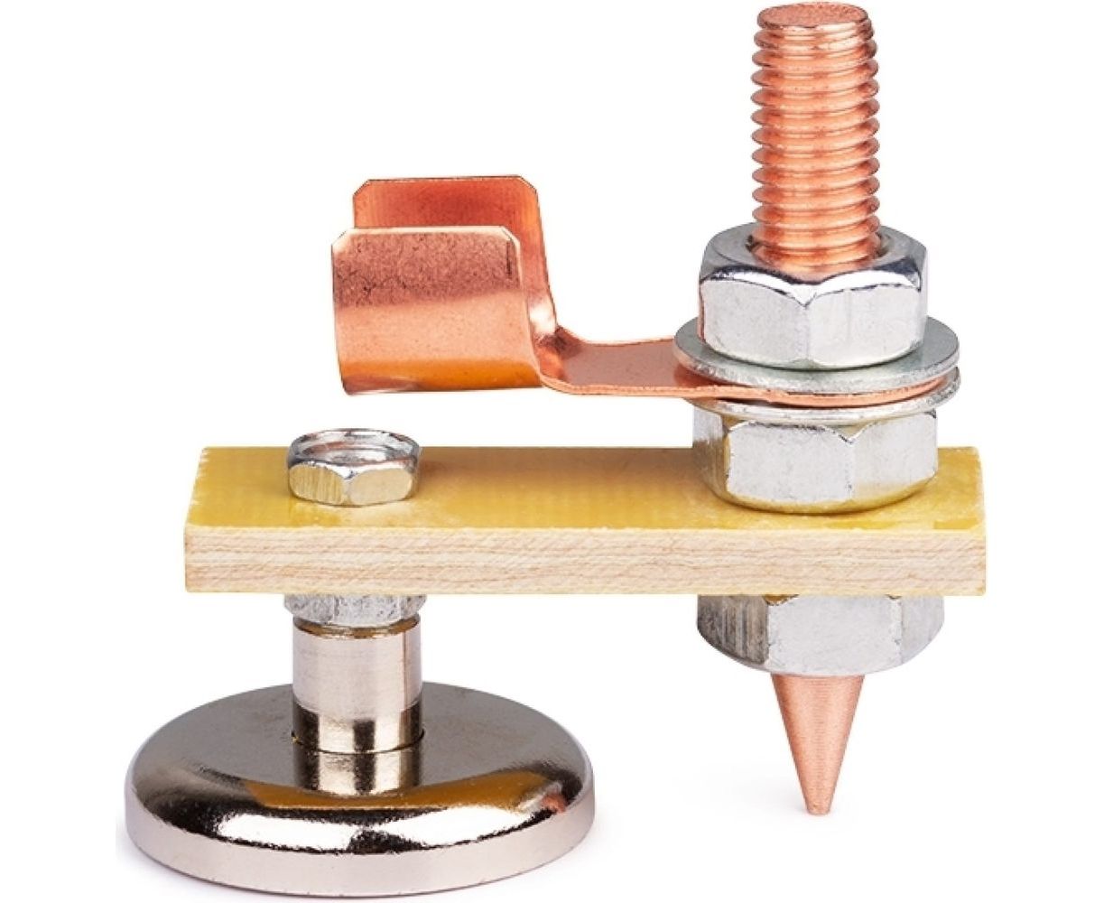 Клемма с одним магнитным креплением (одинарная) и подходит для всех типов сварочных аппаратов при токах до 200А. Высота расположения контактного болта и магнита регулируется путем затягивания или ослабления соответствующих крепежных болтов.
