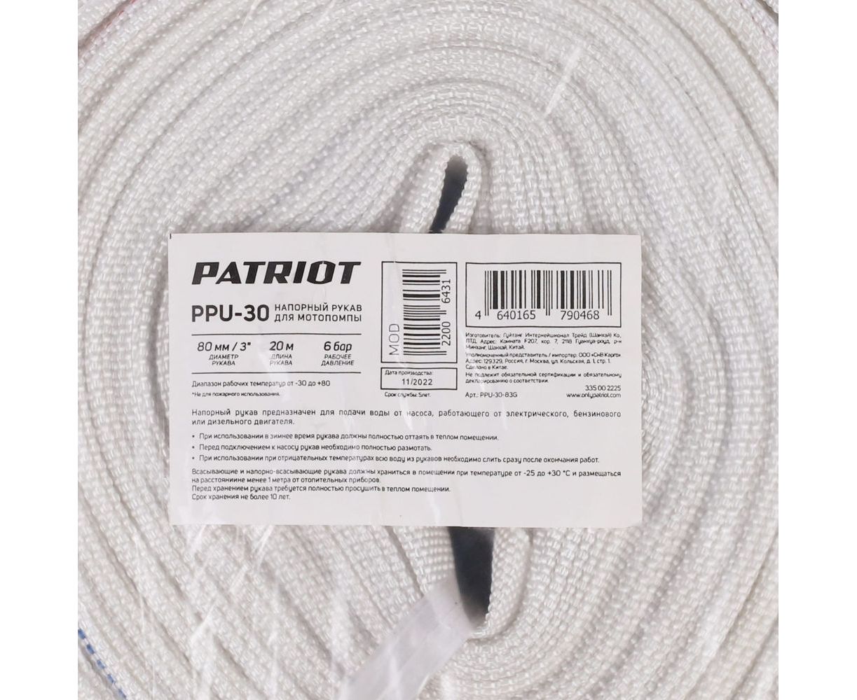 Рукав напорный PPU-30 (длина 20 м, 80 мм - 3 дюйма) Patriot 335002225