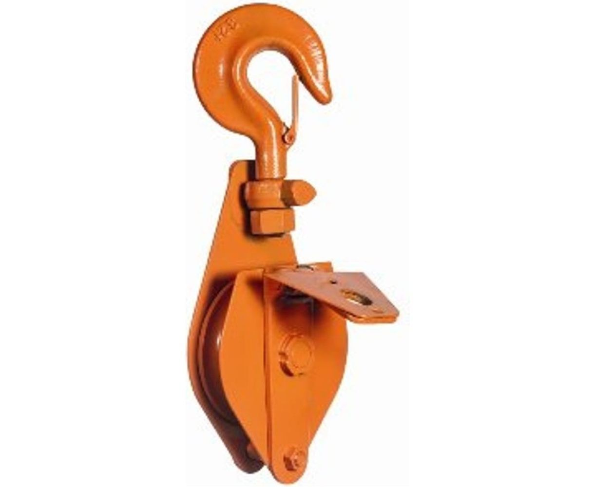 Блок шкивовый однорольный с крюком и откидной щекой 5 т Сибталь 010 0008 5000 можно использовать как для подвешивания груза, так и для его крепления. Данный тип блока является наиболее популярным, так как откидывающаяся щека позволяет быстро заправить канат в блок.