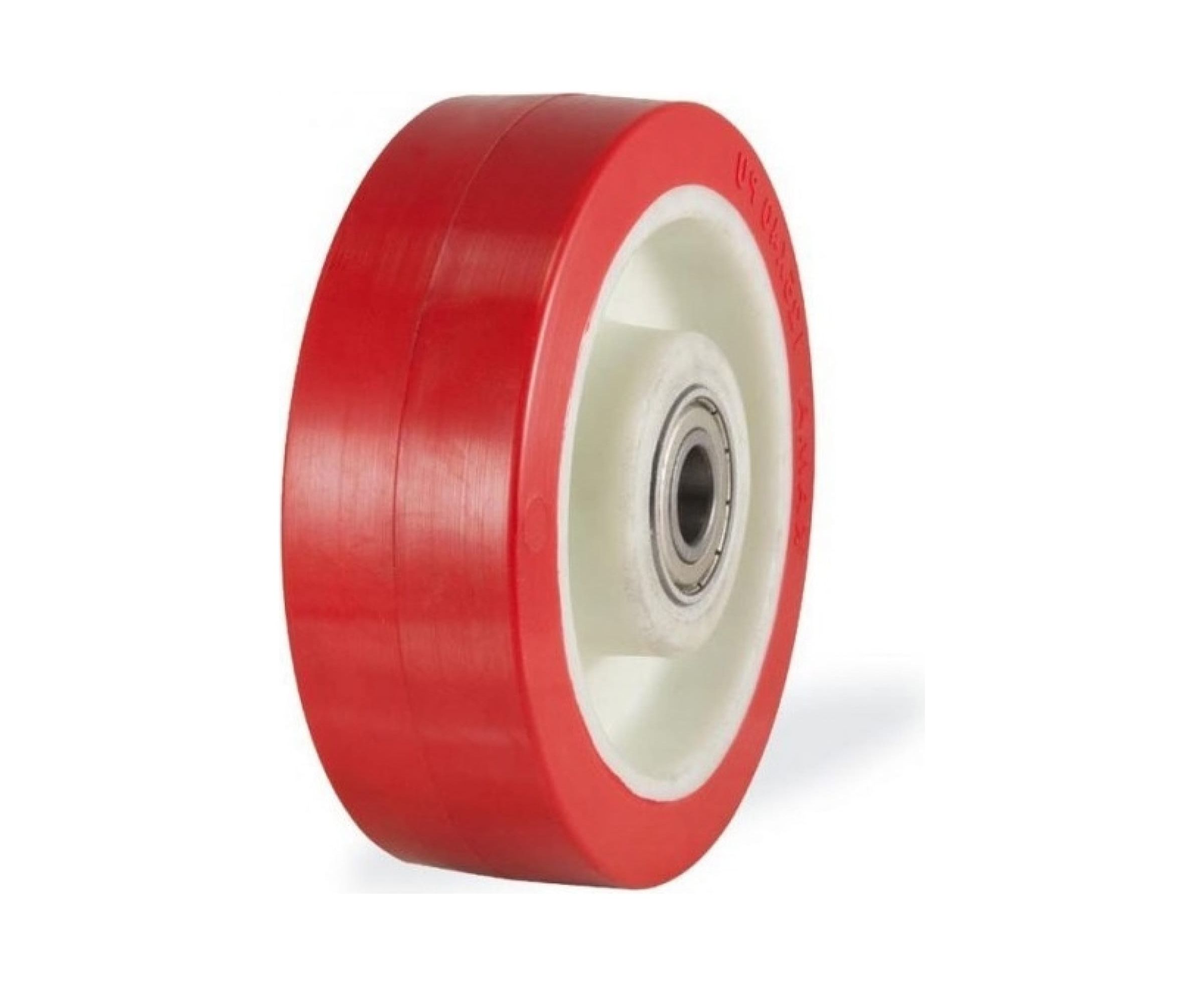 Обод колеса изготовлен из высококачественного полиамида белого цвета, контактный слой из полиуретана красного цвета твердостью 96 Shore A.