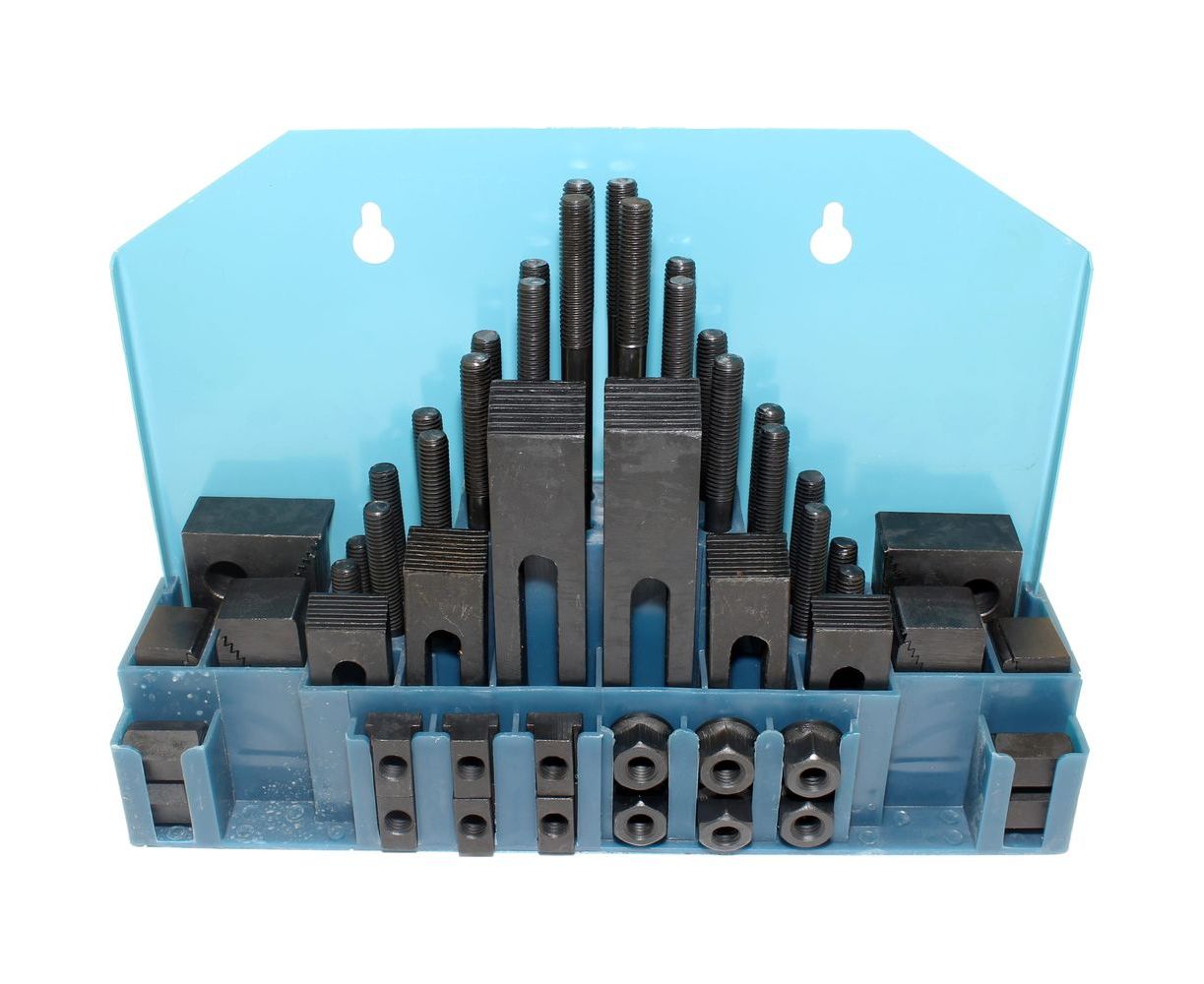 Набор клиновых ступенчатых прижимов (58 предметов, паз 15.7 мм, М12x1.75 мм, металлический футляр, YT-0205) CNIC 34930 предназначен для фиксации заготовок, деталей сложной формы при дальнейшей обработке на фрезерных, сверлильных и других станках, имеющих ширину паза 15.7-16 мм на столе.