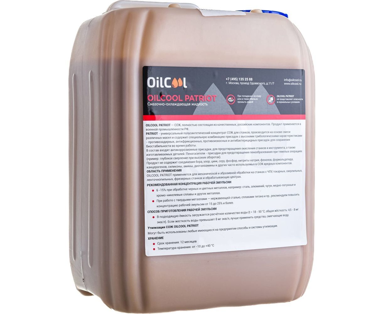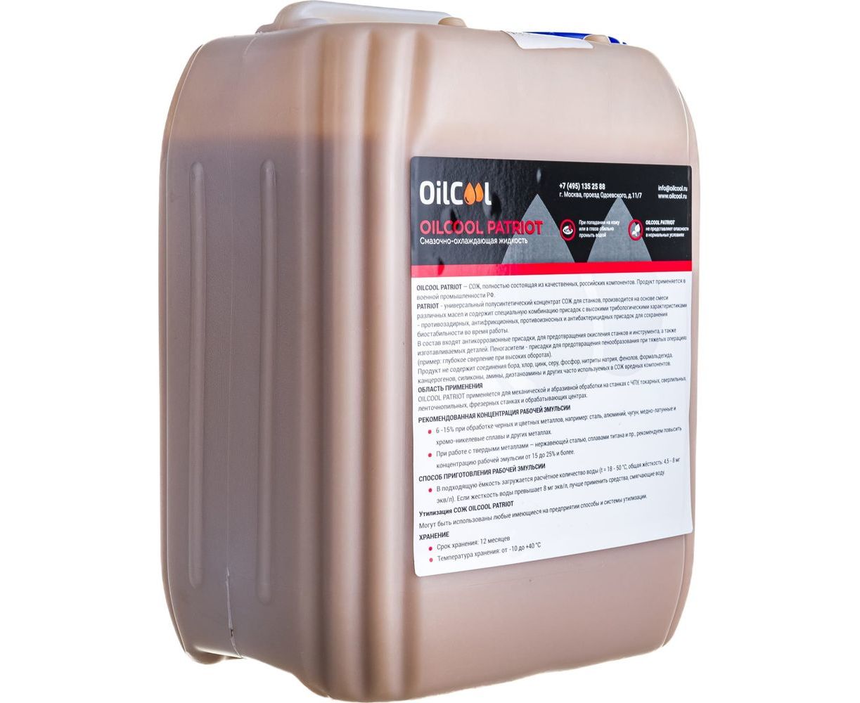 Концентрат СОЖ PATRIOT, 5 литров OILCOOL PATRIOT5 применяется применяется при механической и абразивной обработке черных и особенно цветных металлов. Рекомендованная концентрация рабочей эмульсии составляет 6 -15%, при работе с твердыми металлами — нержавеющей сталью, сплавами титана и пр., рекомендуется повысить концентрацию рабочей эмульсии от 15 до 25% и более.