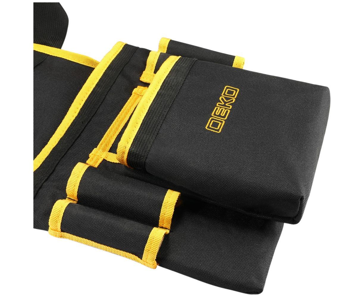 Сумка для инструментов DEKO M 065-0801 идеально подходит для хранения и переноски инструментов. Сумка-пояс пригодится строителям и монтажникам, а также будет полезна в быту. На пояс надеты 2 сумки, между которыми имеется держатель для молотка, поэтому инструменты можно распределить равномерно. Сумка изготовлена из прочного материала и прослужит долго. Карманы разных размеров позволяют вместить все необходимые инструменты и расходники. Сумка оснащена пластиковой застежкой-фастекс, благодаря которой сумка надежно держится на поясе.